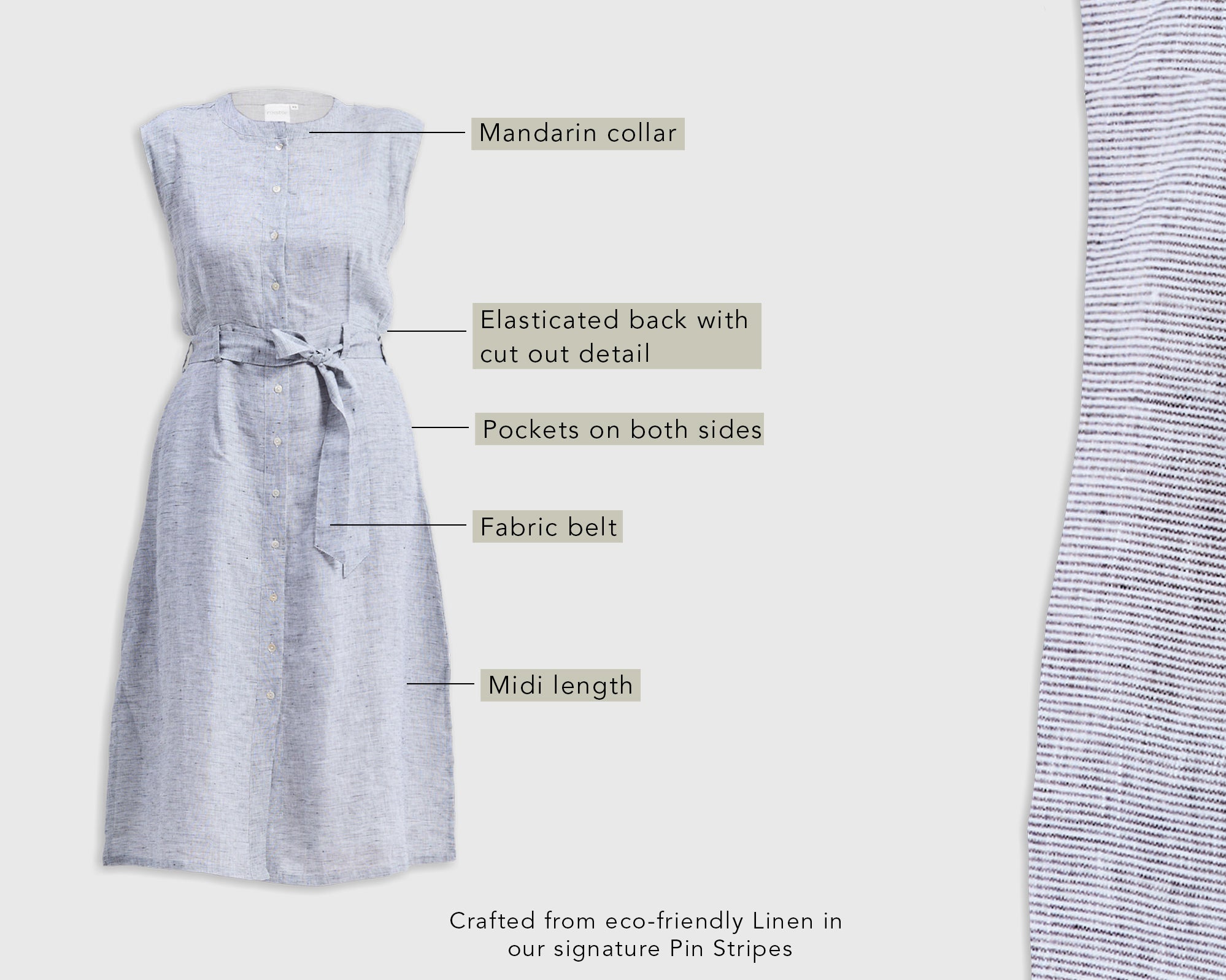 An ultimate wardrobe hero, this piece is a great fusion of classic look meets contemporary style. Featuring pin stripes and a back-cutout detail, this dress is one of its kind: chic, eco-friendly, comfortable, and effortlessly stylish!