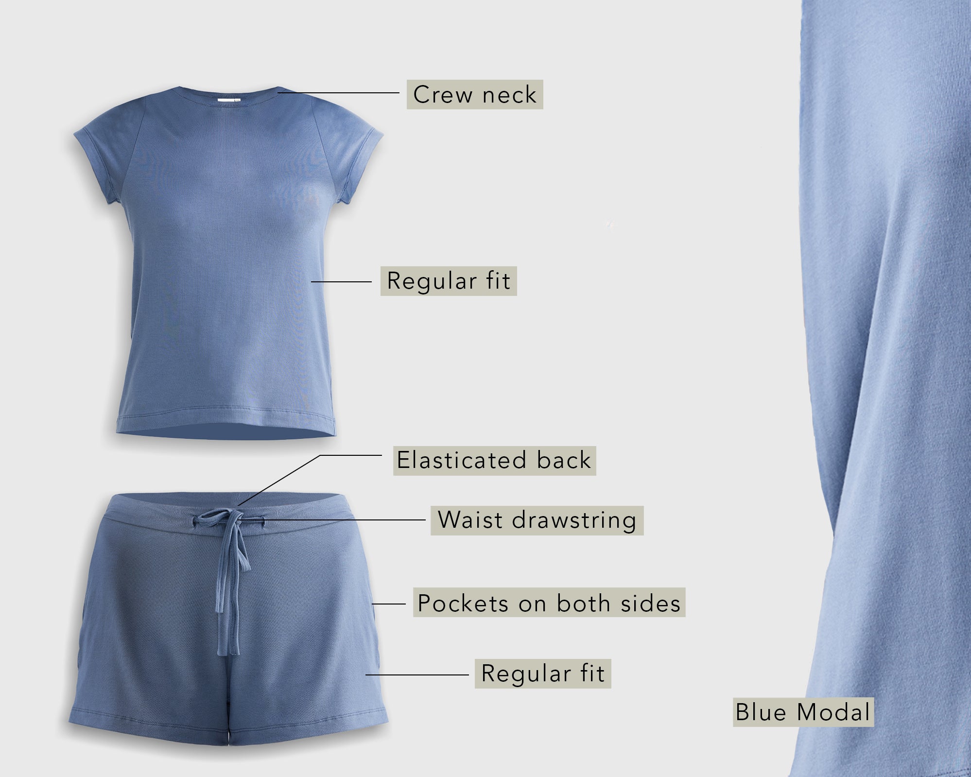 Soft, stretchy, and effortlessly versatile, this short-sleeve tee paired with knit shorts in blue is designed for all-day comfort and and effortless style, whether you're lounging at home or running errands.