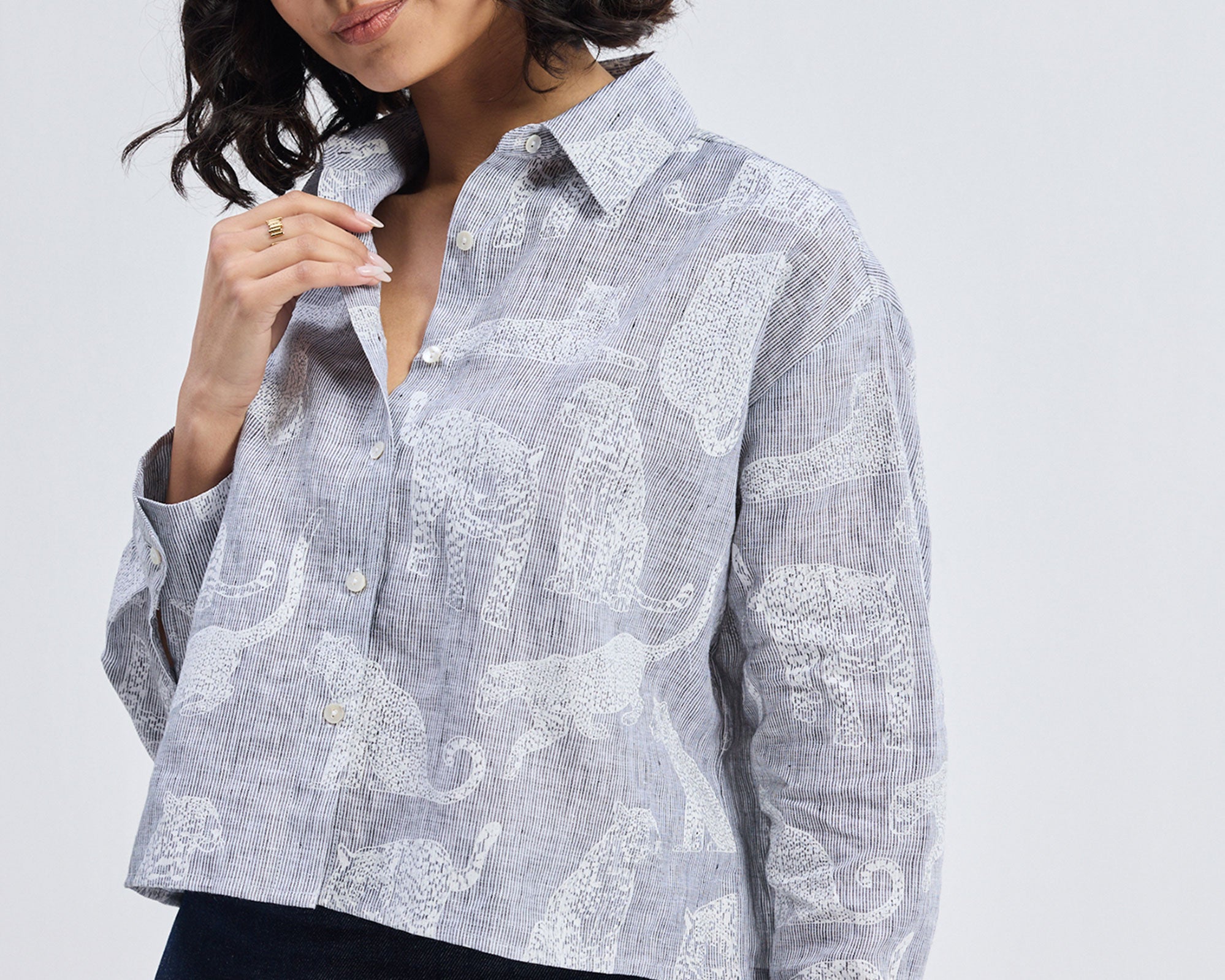 Cool, effortless, and ultra-comfy! This oversized boxy-fit linen number features a button-down front, long cuffed sleeves, and an intricate, handprinted animal theme on a sleek grey backdrop. It’s eco-friendly, soft, breathable, lightweight yet extremely stylish; just perfect for warm-weather dressing.