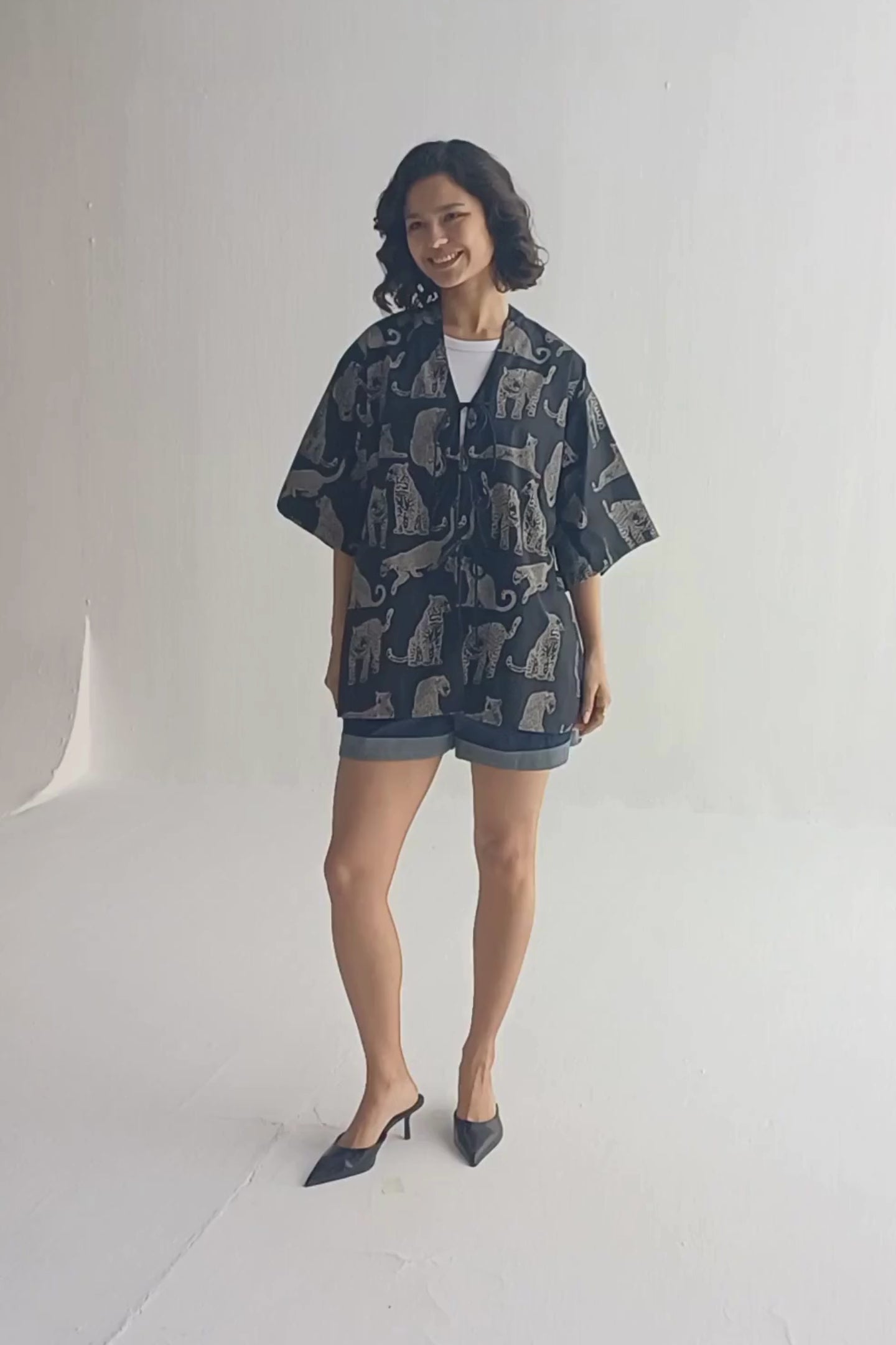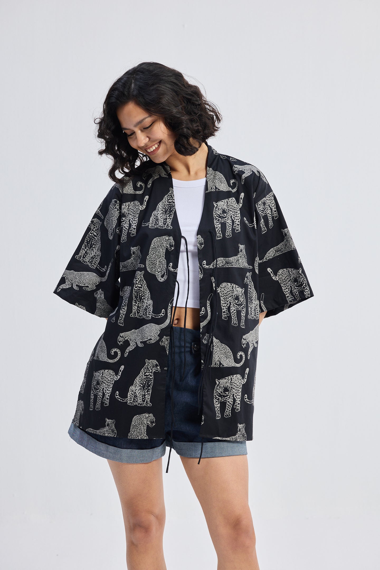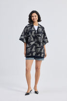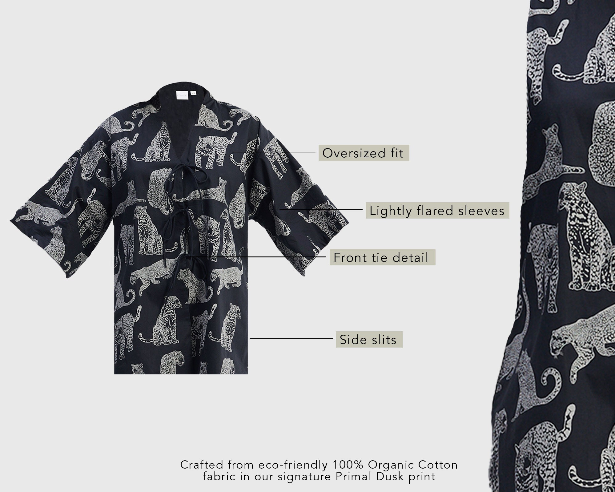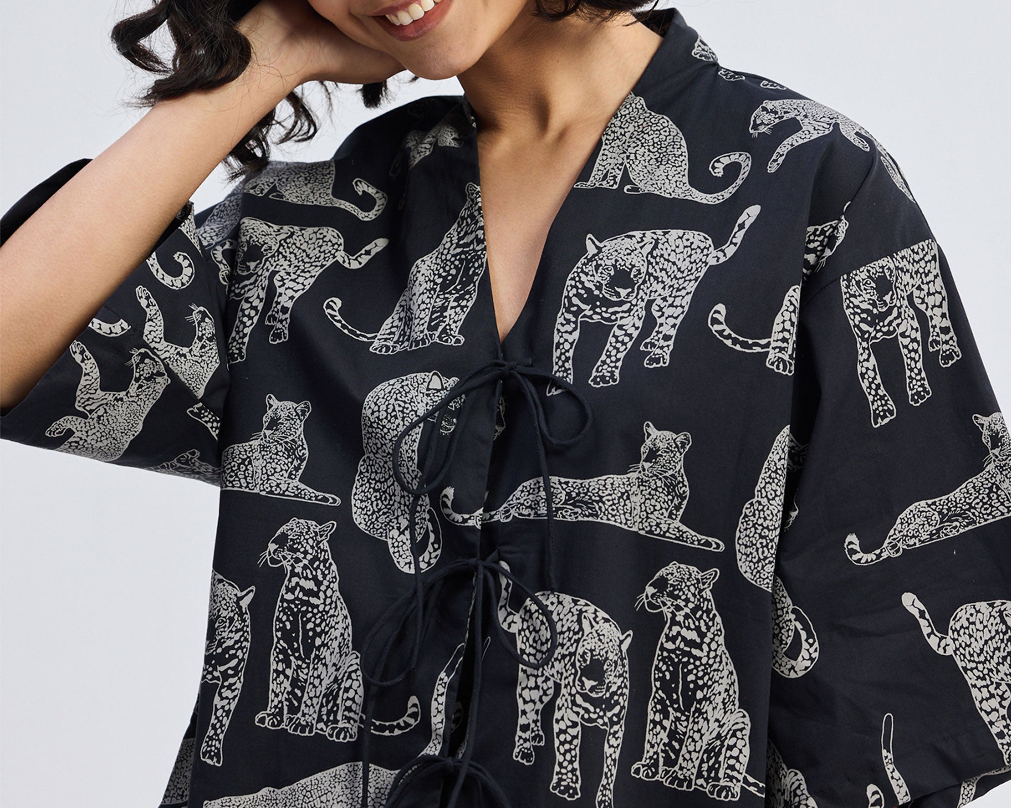 Bold, breezy, lightweight, and effortlessly cool! Wear it as an oversized shirt or as an overlay - this oversized animal-print shirt is all about comfort and style. Featuring a front-tie detail, side slits, and flowy flared sleeves, it’s made from breathable 100% cotton fabric: perfect for warm-weather days.