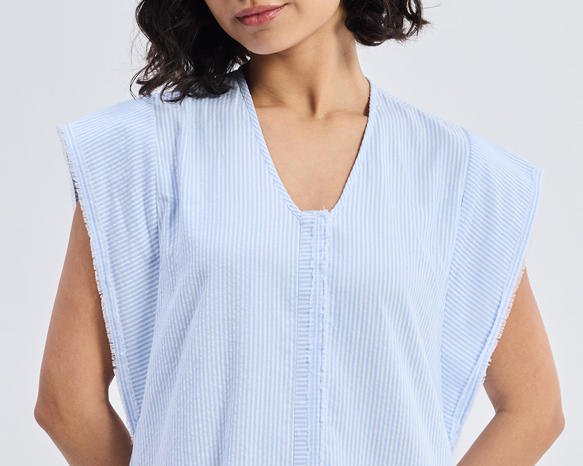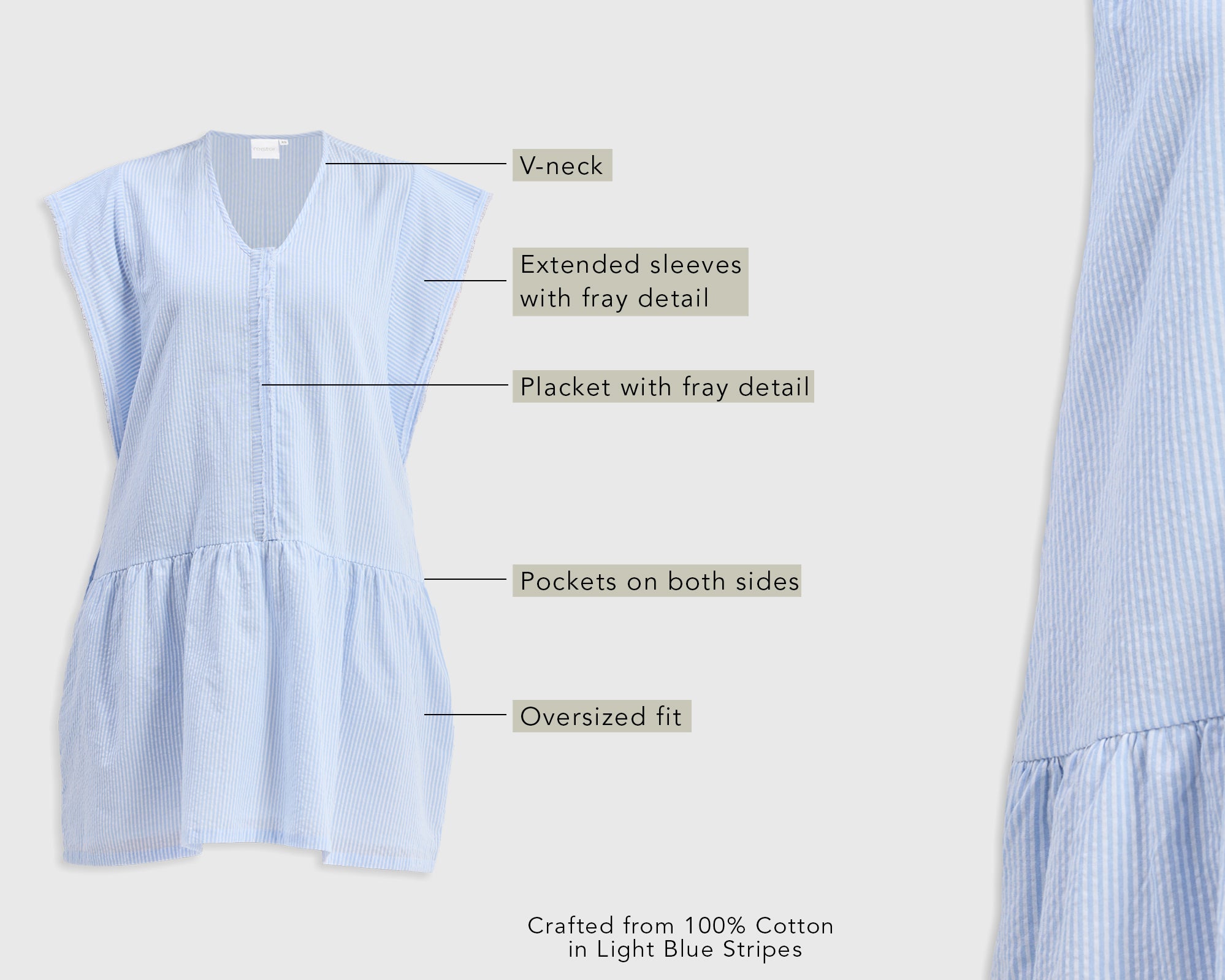 The oversized fit and the V-neck design of this classic dress makes it infinitely versatile. Dress it up with heels for a polished look or tone it down with sneakers and sandals for a casual day out. Layer with a denim jacket for casual work days. The frayed sleeves and the pinstripes will give your outfit a chic yet laid-back edge.