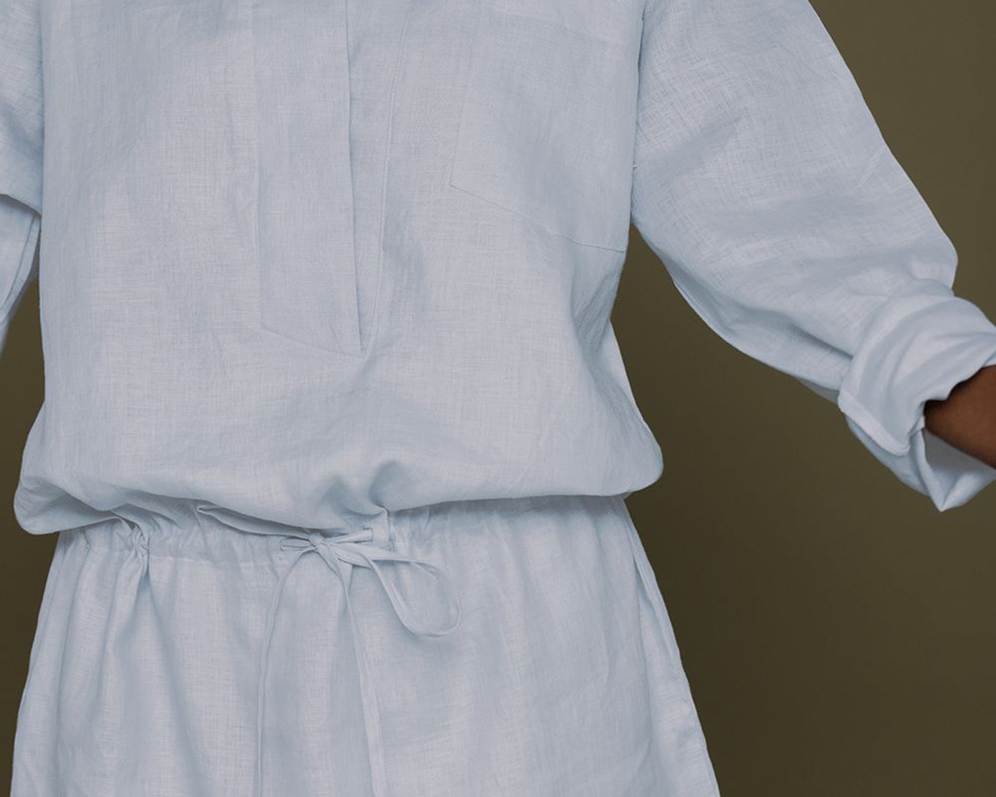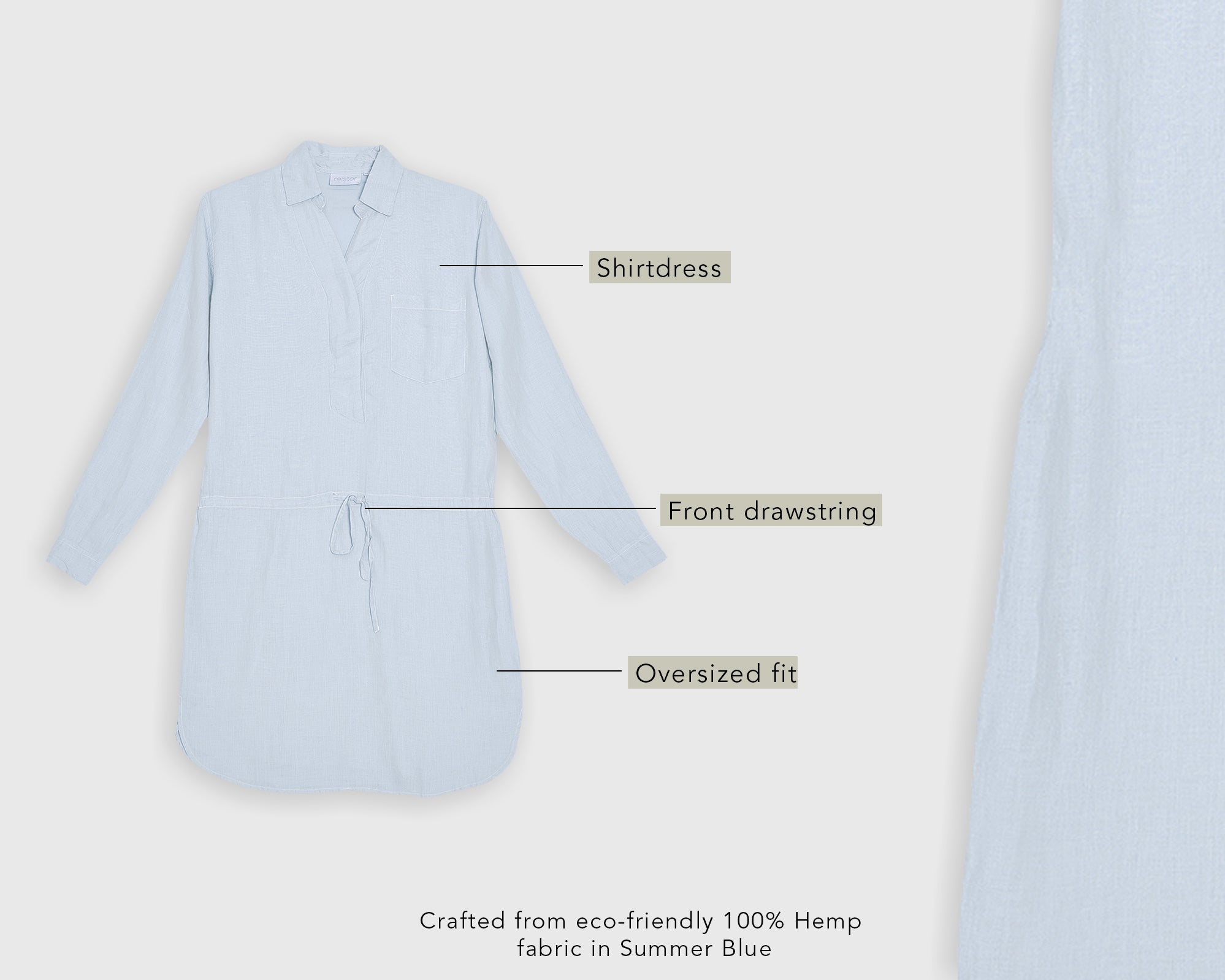 Subtle sophistication and contemporary style come together in this oversized, collared shirt dress in blue with a front pocket and adjustable drawstring.