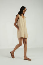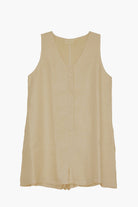 This cute Romp And Play Romper is an absolute summer-essential owing to its relaxed, airy fit and breathable hemp fabric. The classic beige color gives it a solid neutral base for countless ways of styling. Signature pin tucks along the placket add sophistication, while functional pockets on both sides provide practicality without compromising style.