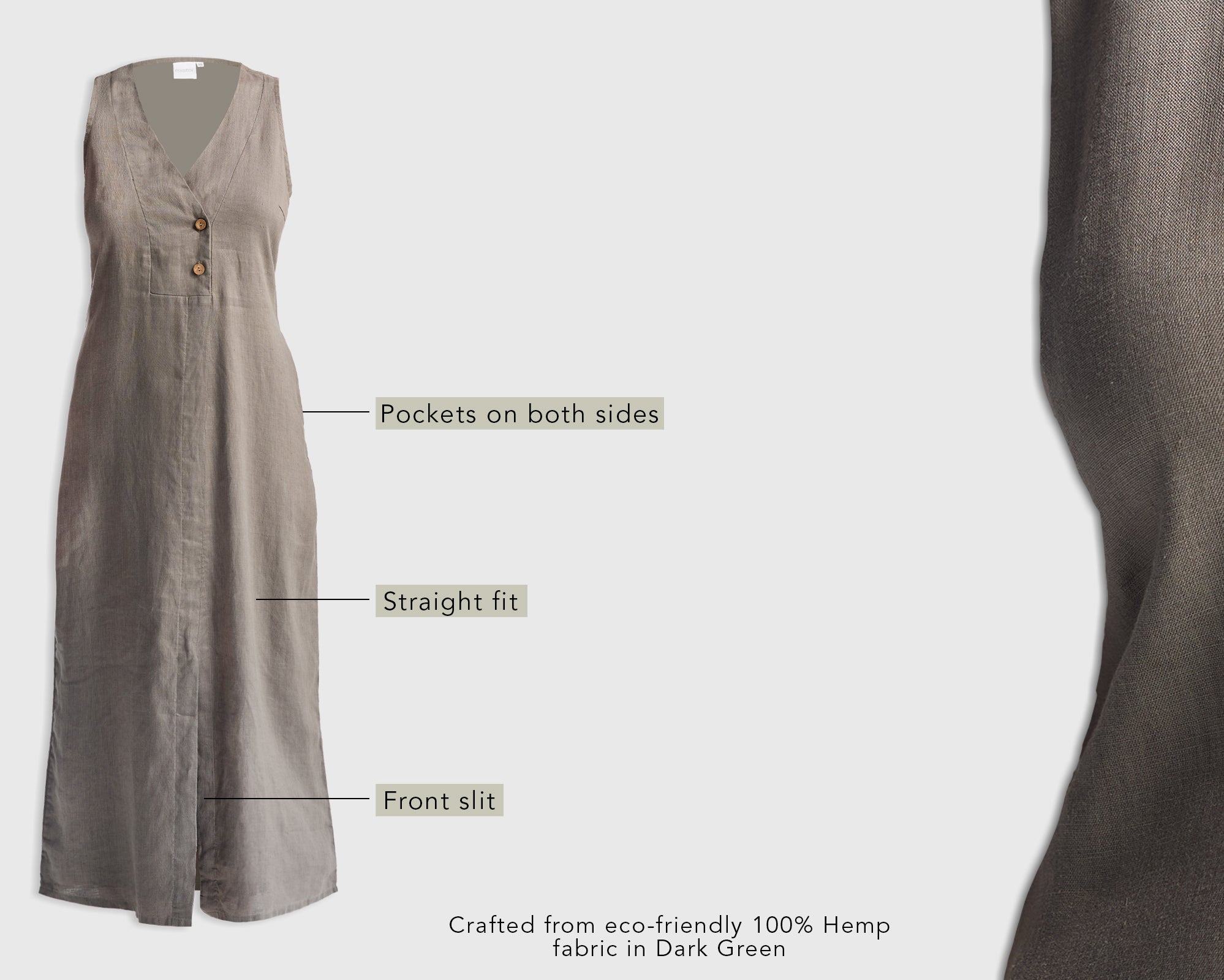Straight Dress with Front Slit in Dark Green Hemp