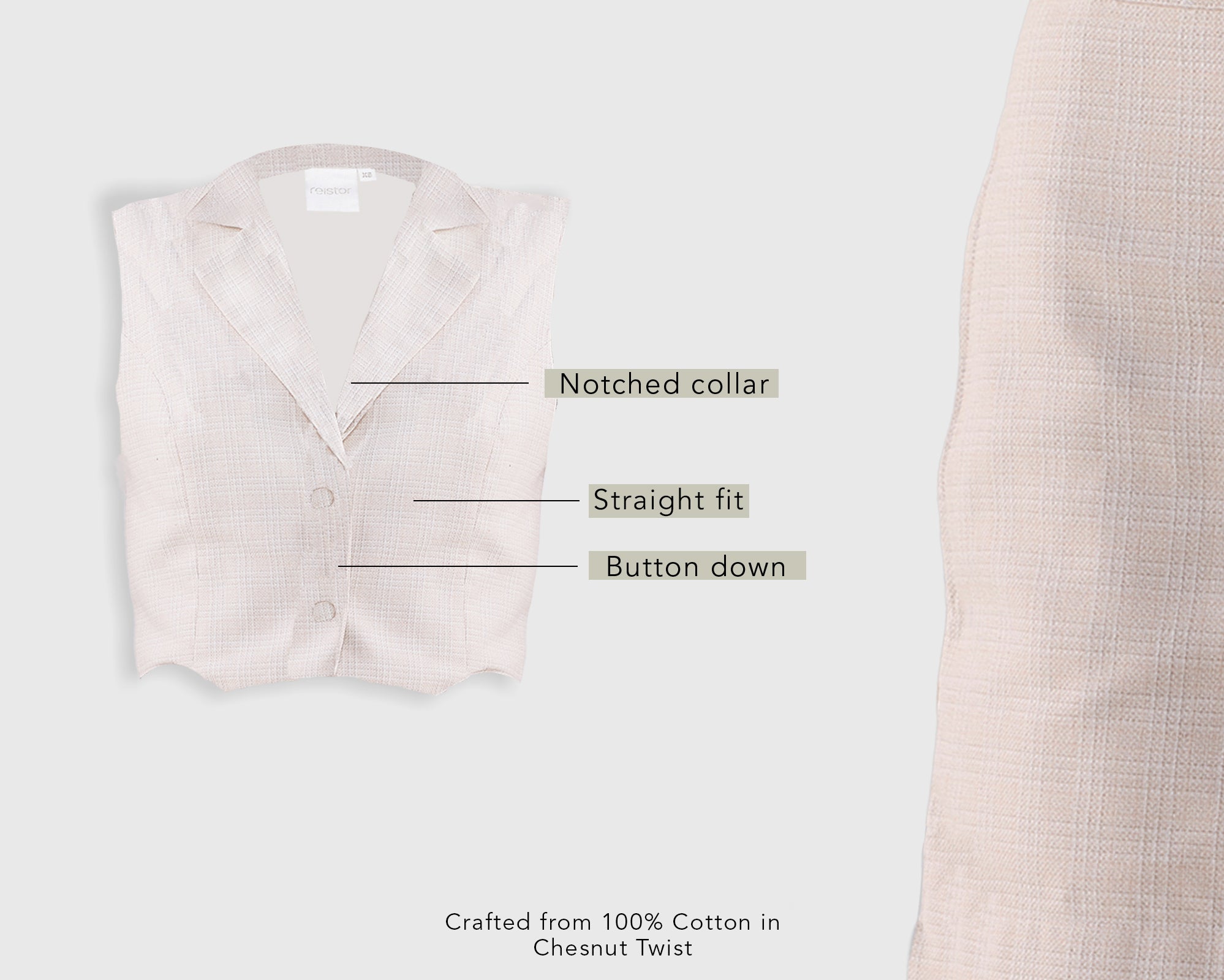 This cropped vest in cream color is consciously crafted for a tailored yet comfortable fit that enhances your silhouette. With its button-down notched collar look, this sleeveless vest is perfect for both casual and semi-formal occasions. It is made from the softest eco-friendly cotton tweed that helps you dress the part no matter where your day takes you.