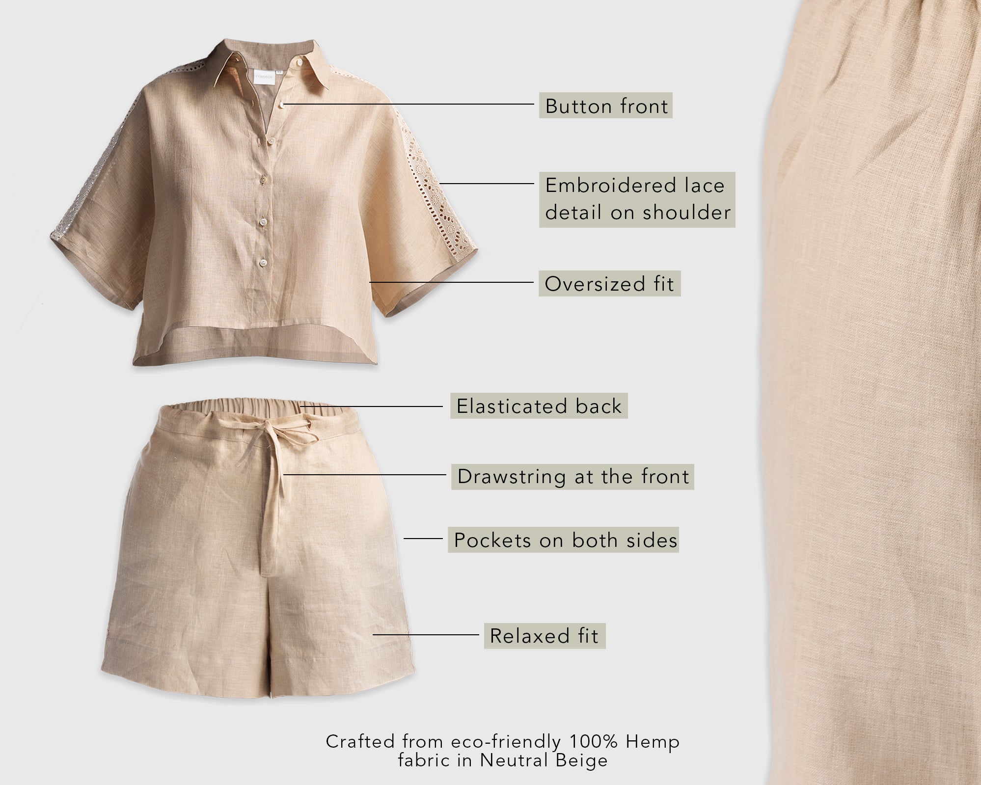 Includes - Boxy Shirt with Lace and Drawstring Shorts in Neutral Beige