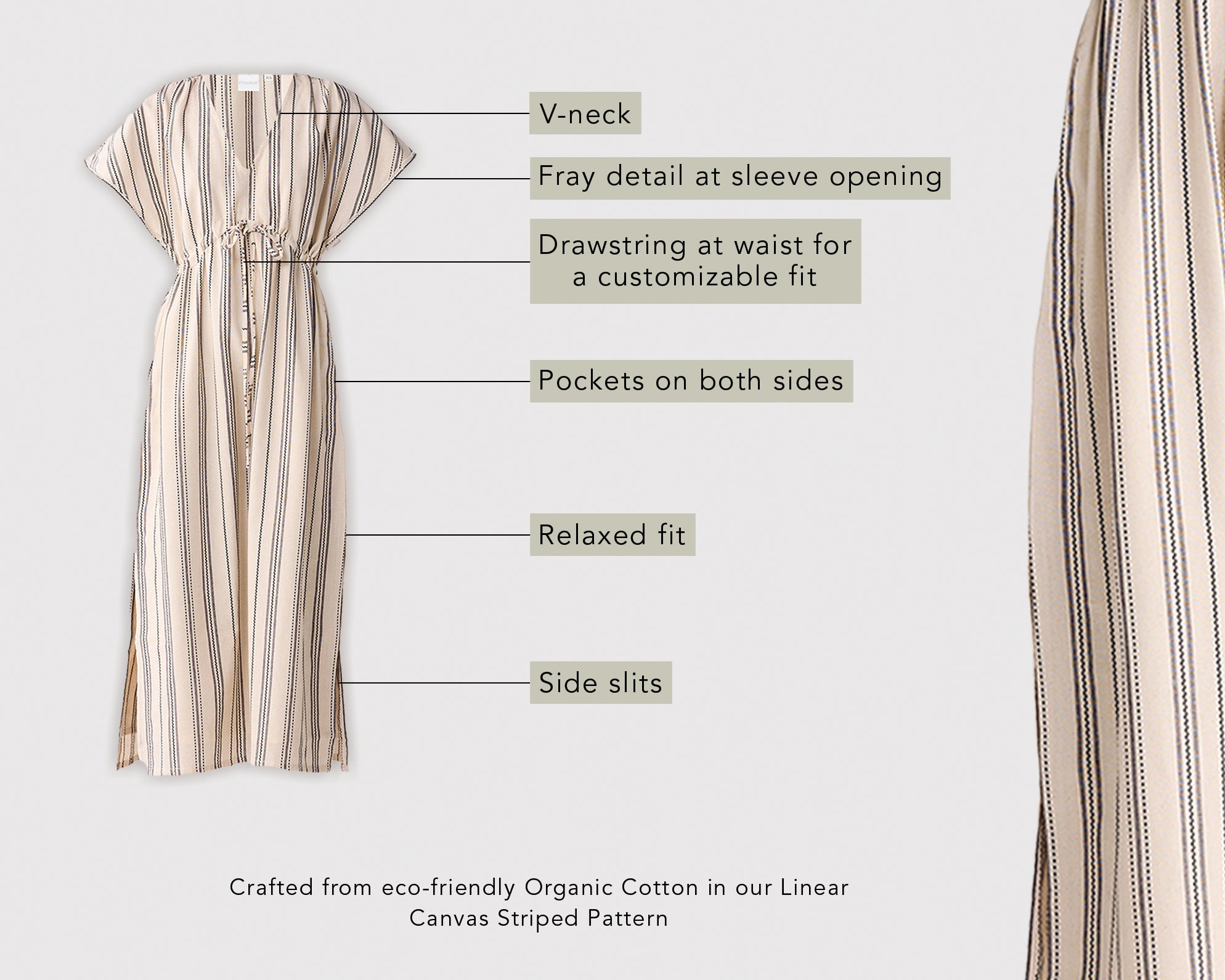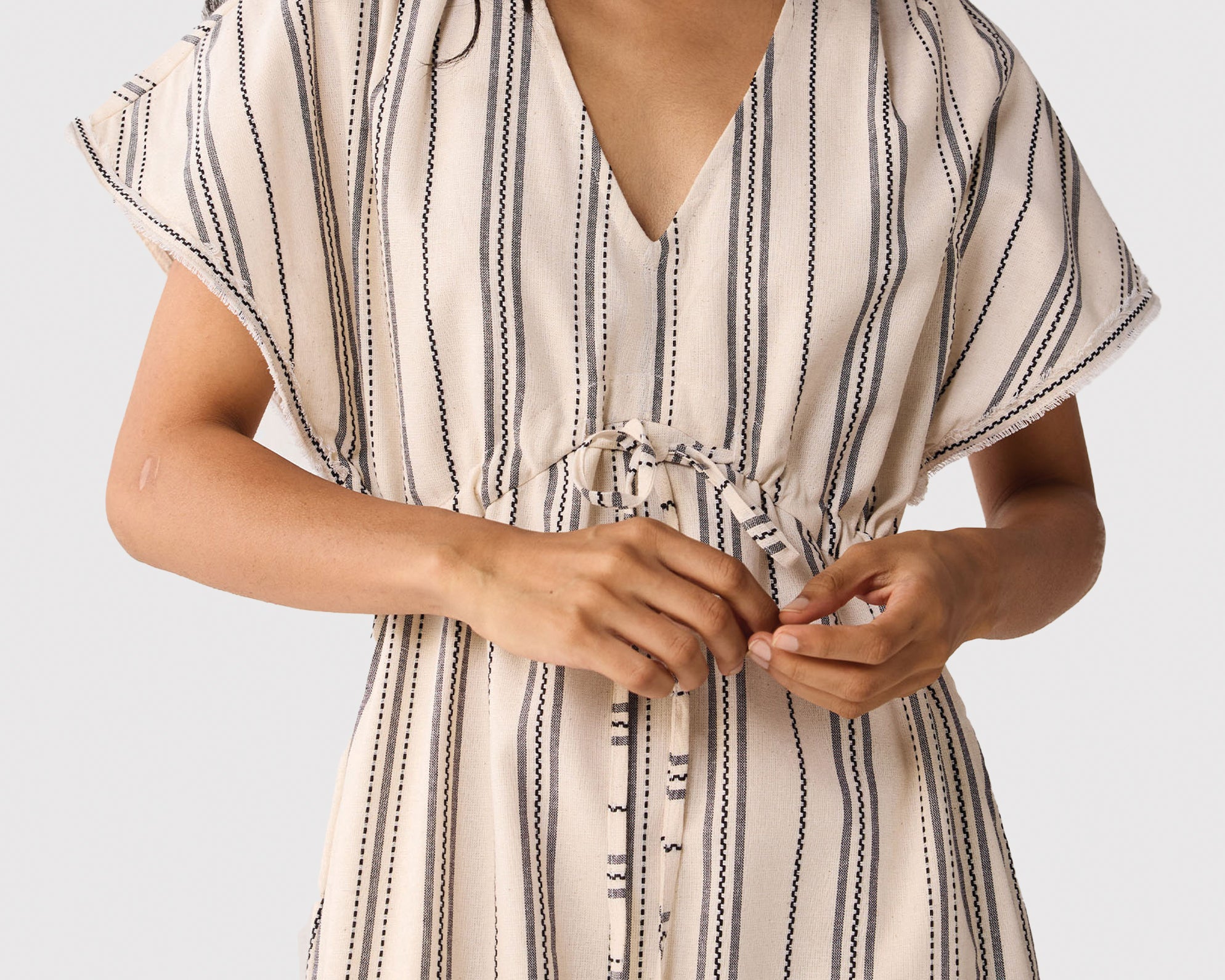 This chic vacation dress is all about style and ease rolled into one. The 100% organic cotton fabric feels breathable, and light, making it perfect for resort stays, beach days, and warm weather vacations. The intentional details like relaxed fit, customizable drawstring at the waist, V-neck, frayed sleeves, side slits, and dual side pockets, it’s comfy, breezy, and easy to style.