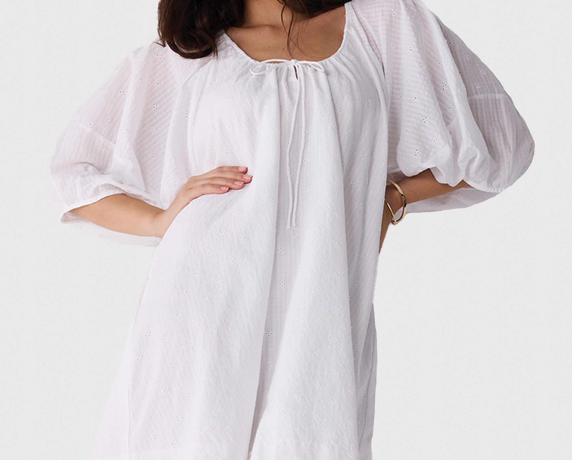 Made from 100% eco-friendly cotton, this chic white dress is lightweight, breathable, and easy on the skin. This piece is thoughtfully made with intentional details like a drawstring neckline, puff sleeves, and a relaxed short length for comfort and airflow. Functional side pockets add ease, while the classic silhouette keeps it stylish, easy, versatile, and vacation-ready.