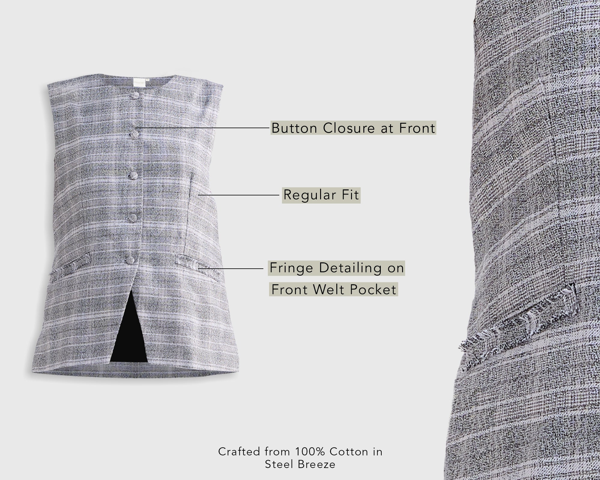 Whether you’re heading to a business meeting or a casual outing, this sleeveless jacket is your go-to choice for effortless style. The sleeveless finish and front pockets combined with a complete button closure give it quite a classic appeal. Pair it with our matching Cotton Tweed Shorts for the ultimate stylish look.