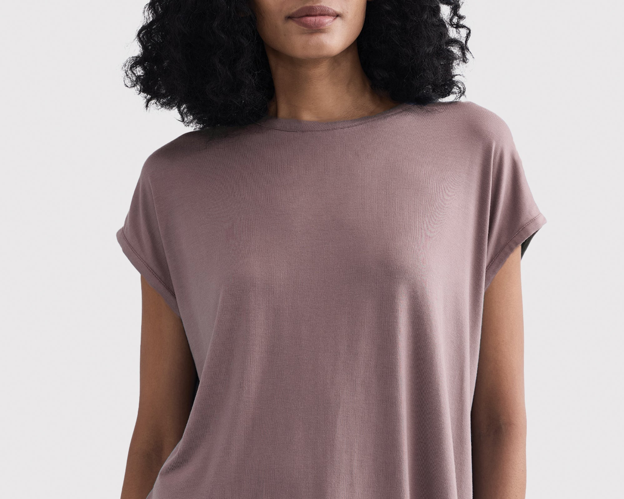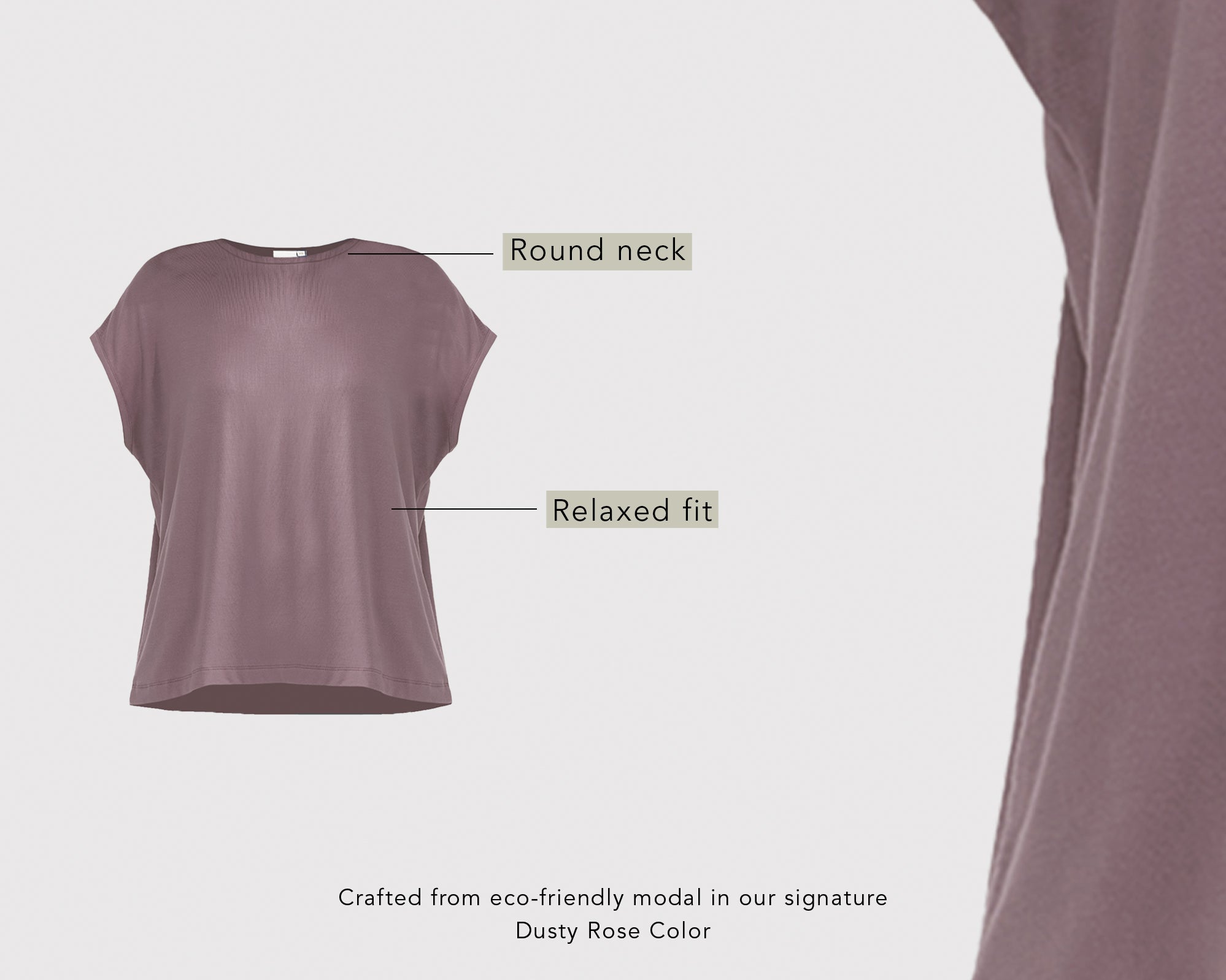 Made from soft, sustainable modal, this relaxed tee drapes beautifully and feels light, breathable, and gentle on the skin. The easy fit and gentle stretch keep you comfortable all day. Style this dusty rose pink tee with the matching modal wide-leg pants, or pair it with jeans, skirts, or shorts for effortless everyday wear.