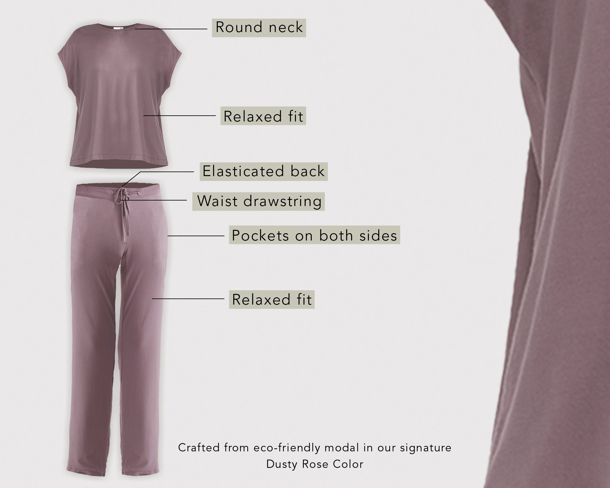 This Relaxed Tee Set in dusty pink features a relaxed-fit tee paired with easy, wide-leg pants, crafted in the softest, breathable knit that feels easy and comfortable to wear. This outfit delivers the comfort of loungewear with a clean, polished look you can step out in. Worn together or styled separately, this dusty rose set offers a quiet, lived-in luxury, the feeling of being perfectly at ease and completely put together.