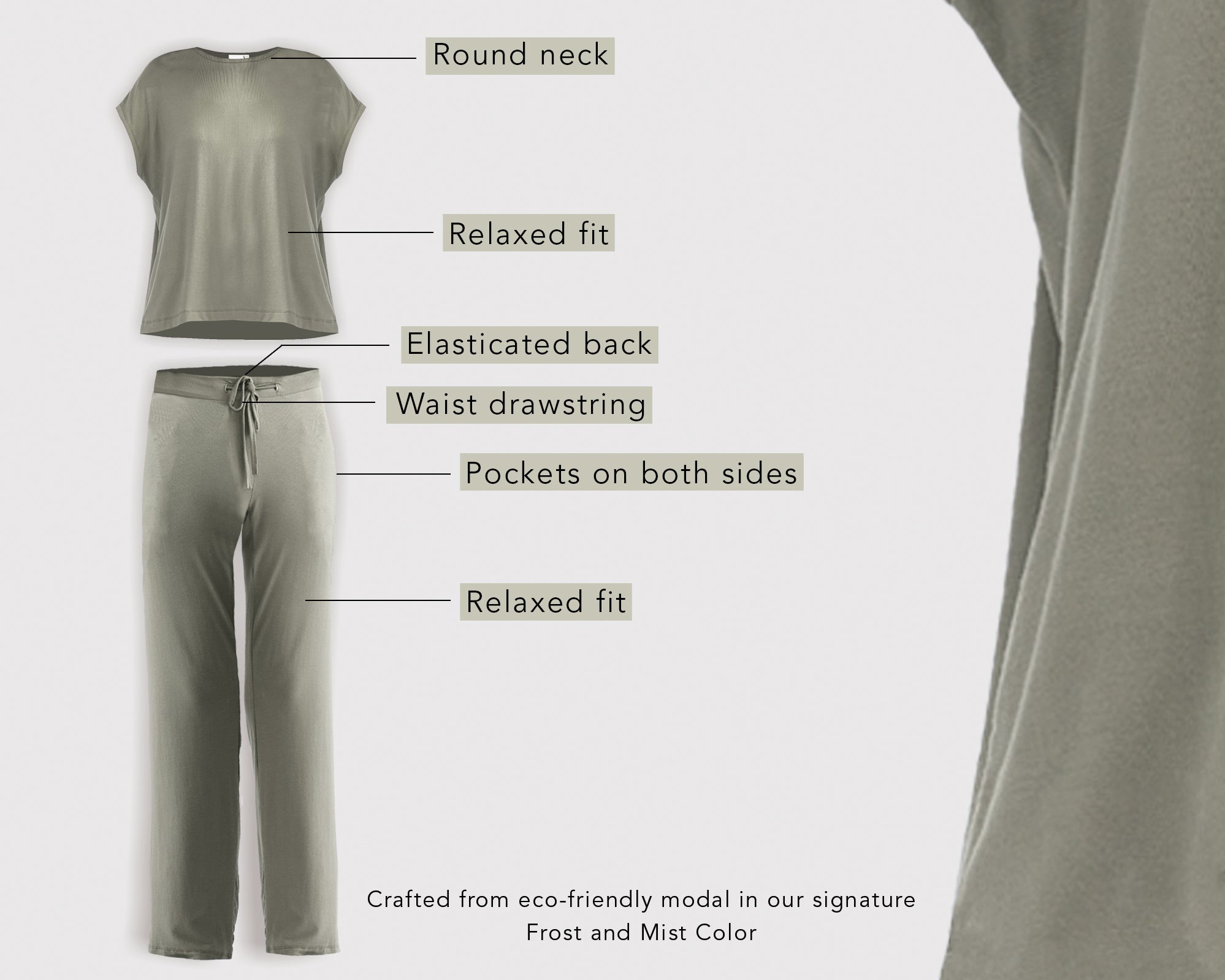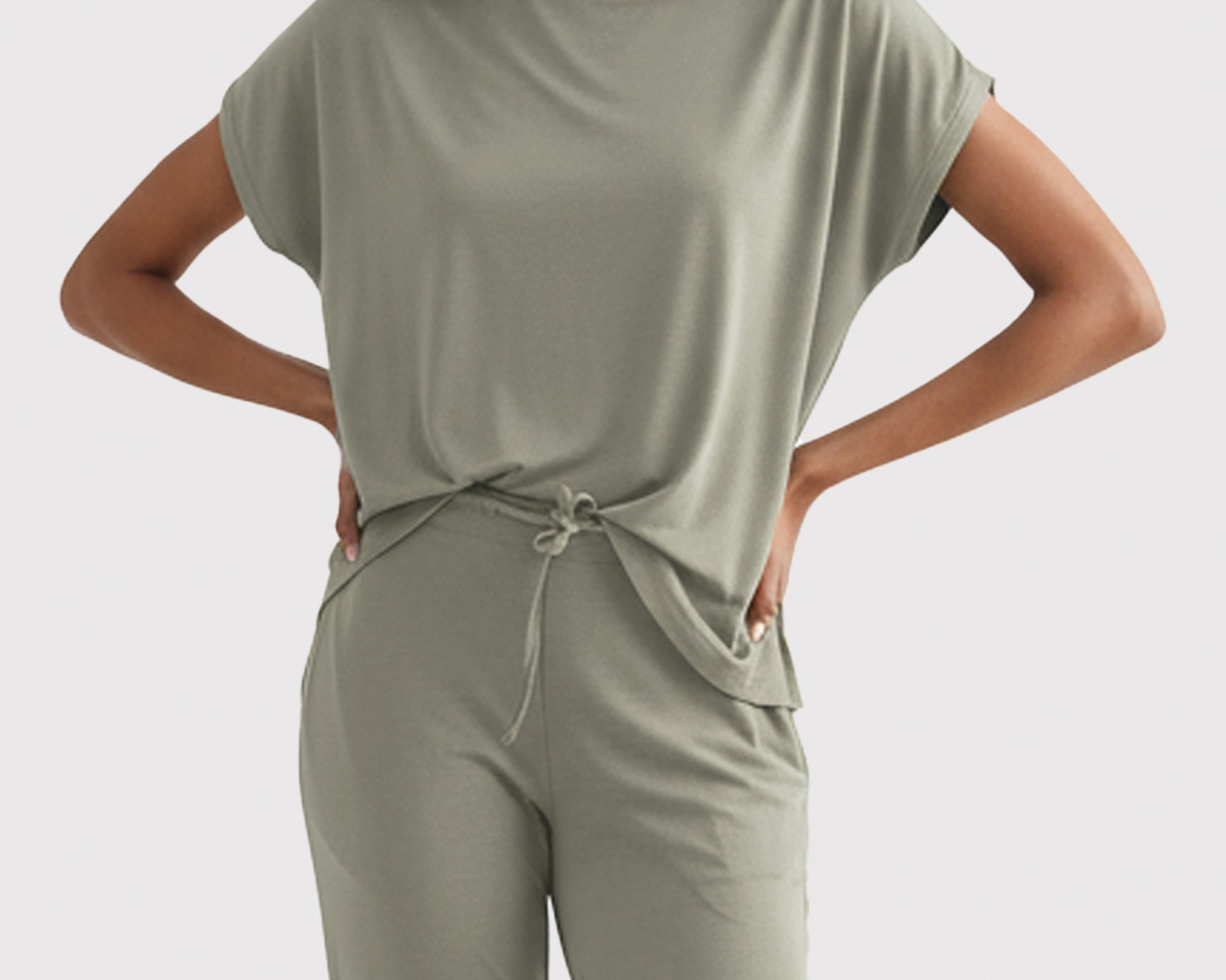 This Relaxed Tee Set in versatile olive features a relaxed-fit tee paired with easy, wide-leg pants, crafted in a soft, breathable knit that feels easy and comfortable to wear. This outfit delivers the comfort of loungewear with a clean, polished look you can step out in. Worn together or styled separately, it offers a quiet, lived-in luxury, the feeling of being perfectly at ease and completely put together.