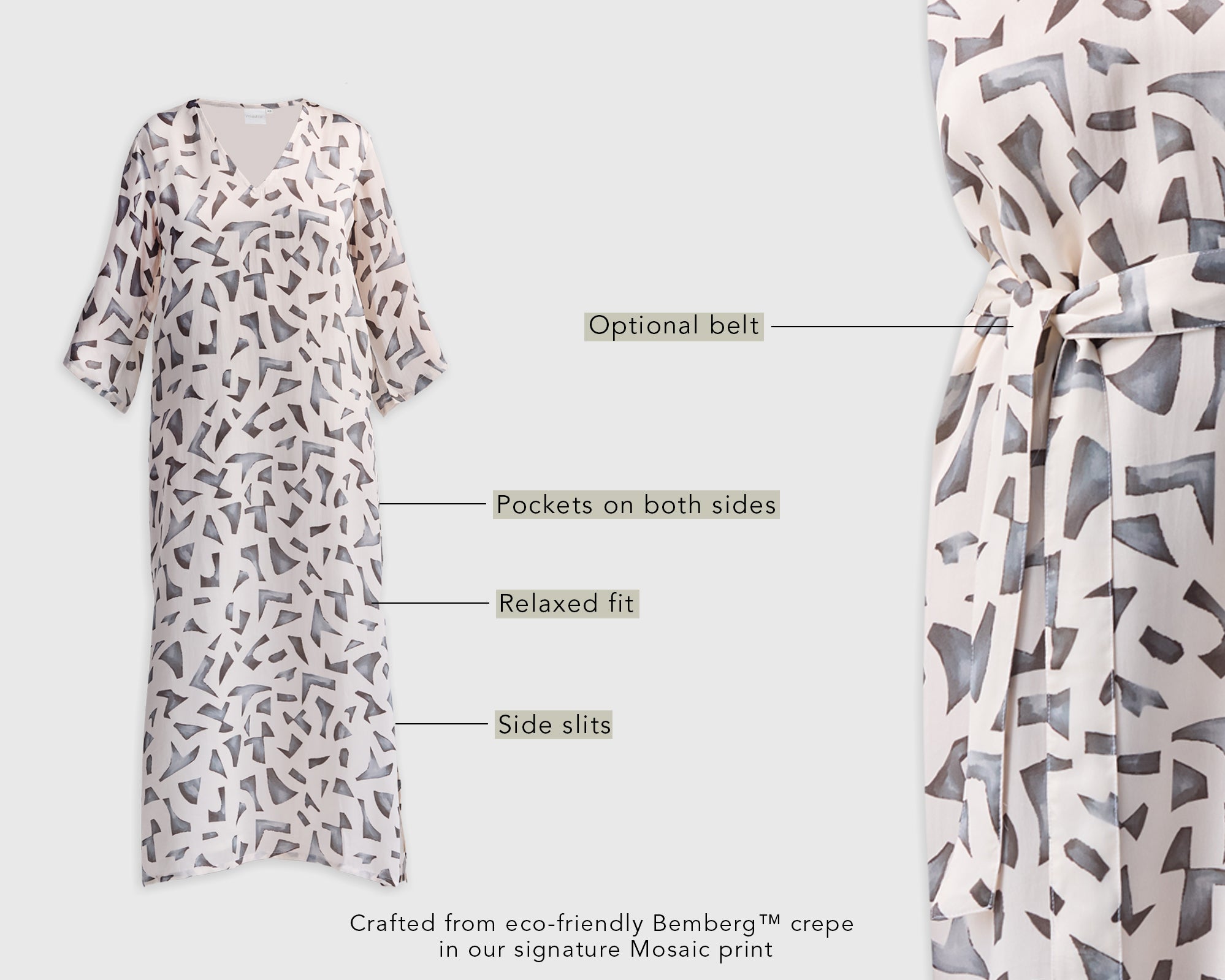 This boxy slip dress with side slits is the perfect mix of laid-back chic and bohemian luxury. Crafted from eco-friendly Bemberg™ crepe, it features a stunning mosaic-inspired patchwork print that adds elegance to any occasion. Its smooth fabric and versatile design make it a must-have for effortless style!