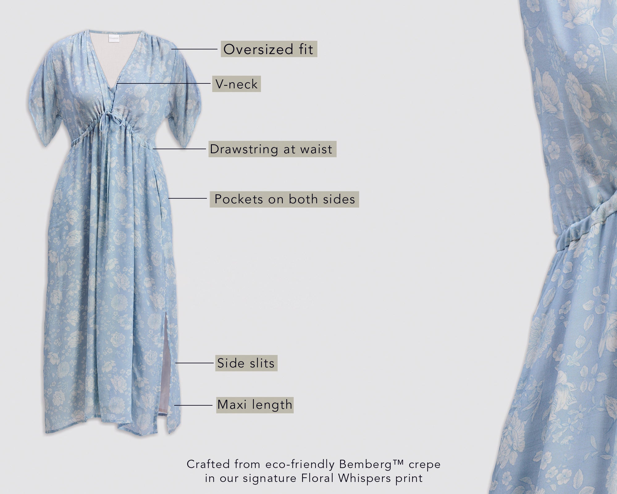 Gathered Maxi Dress with Drawstring in Blue Florals
