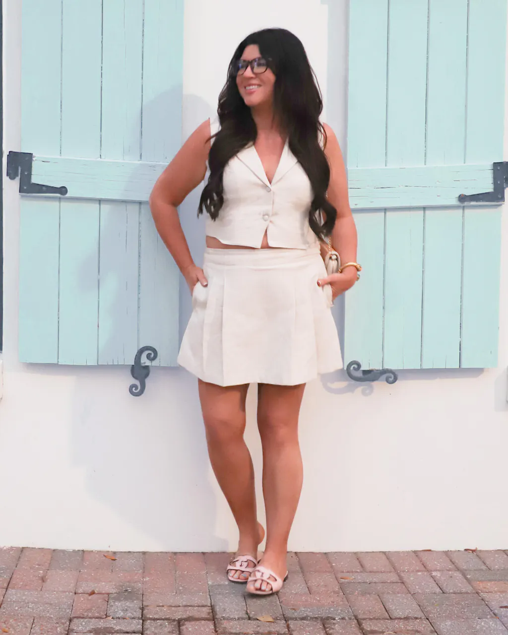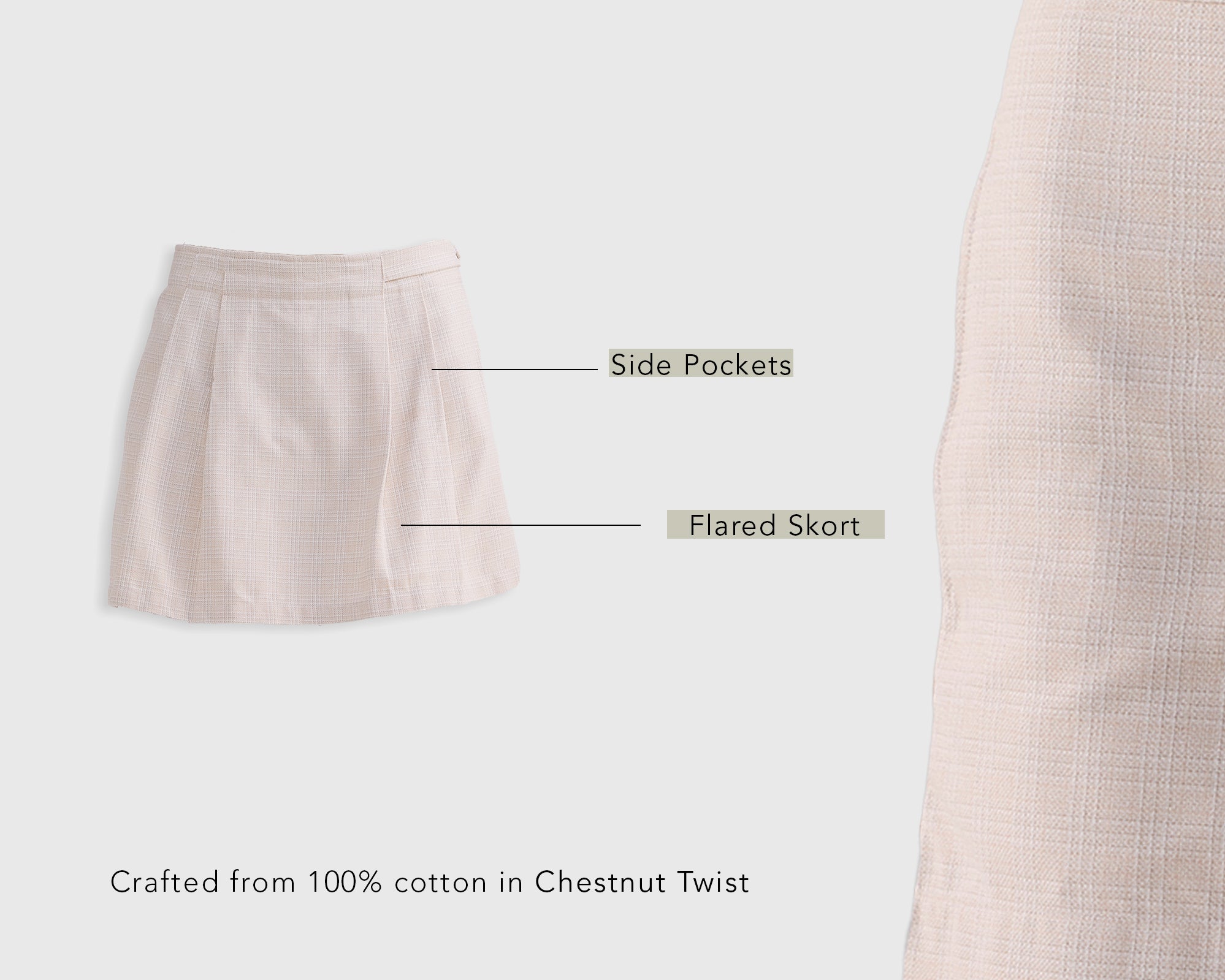 We love how easy-to-wear this stylish skort is! Our cream-colored versatile skort looks stunning when worn with one of our tweed jackets or with a tuck-in t-shirt. The pleated front look and the side pockets make this pair of skorts a perfect addition to your fall wardrobe! Pair with our Cropped Cotton Tweed Vest for an instantly cohesive and effortlessly stylish look.