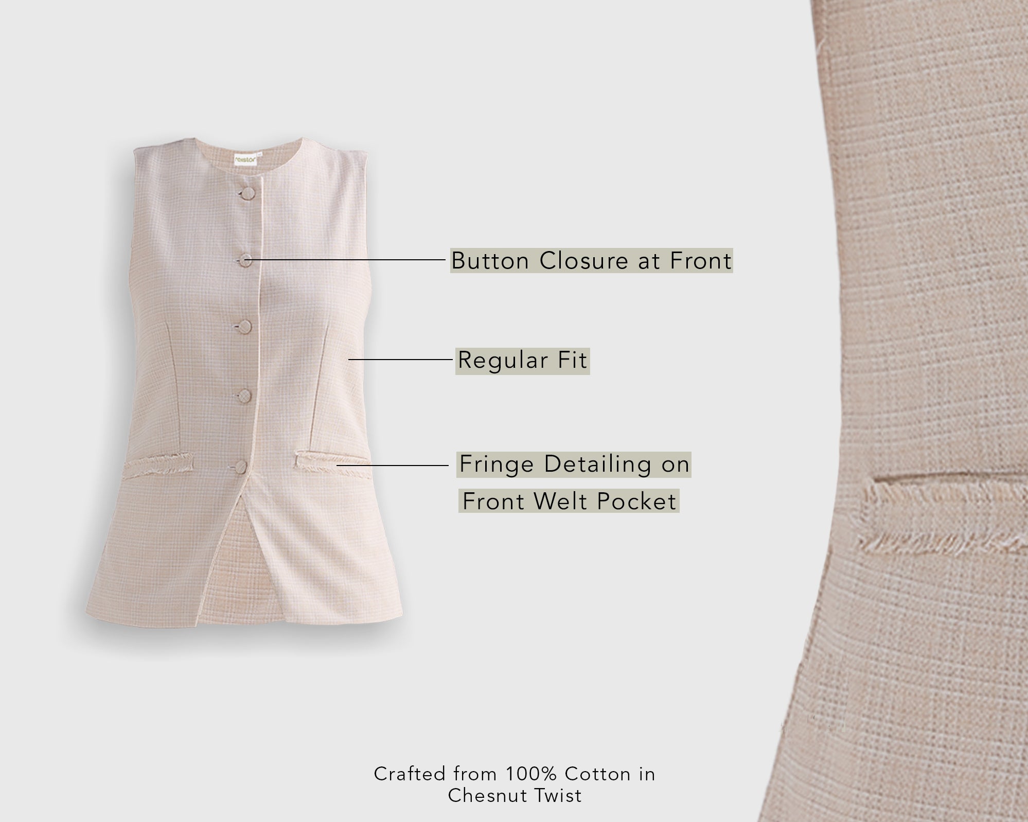 Whether you’re heading to a business meeting or a casual outing, this sleeveless jacket in cream color is your go-to choice for effortless style. The sleeveless finish, round neck, and front pockets combined with a complete button closure give it quite a classic appeal. Pair it with our matching Cotton Tweed Shorts for the ultimate stylish look.