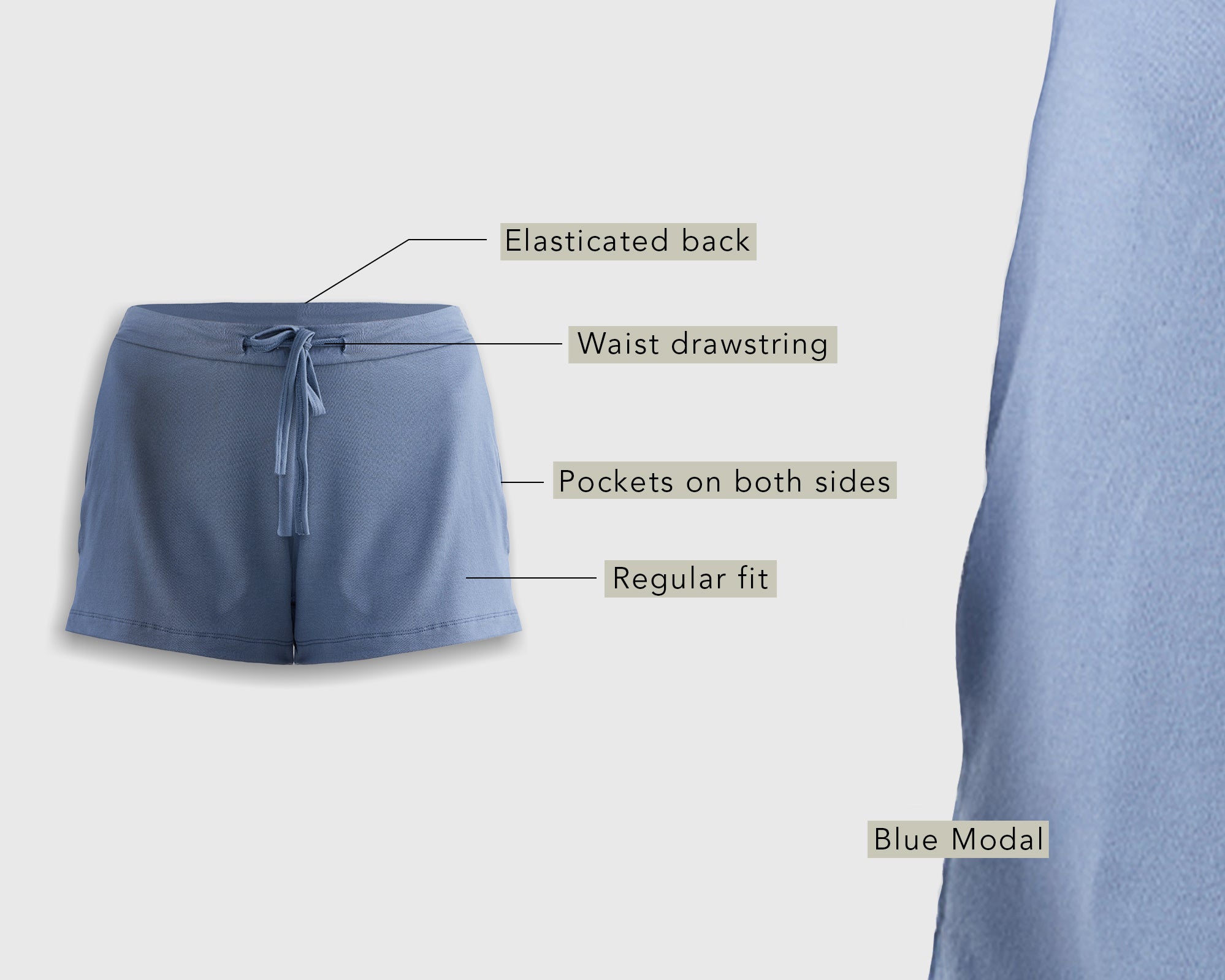 Elevate loungewear with these short, eco-friendly shorts in blue that are super comfy and oh so soft. Pair them with our matching tee or one of your own.