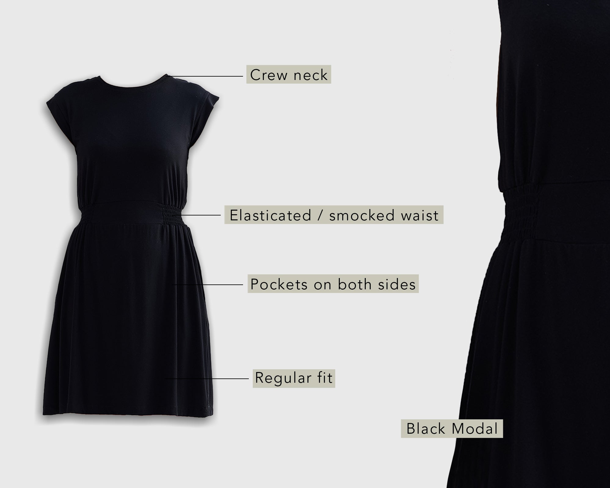 Made from an eco-friendly modal knit, this black dress has a lightly elasticated cinched waist for a customized and flattering fit while the side pockets offer comfort and style.