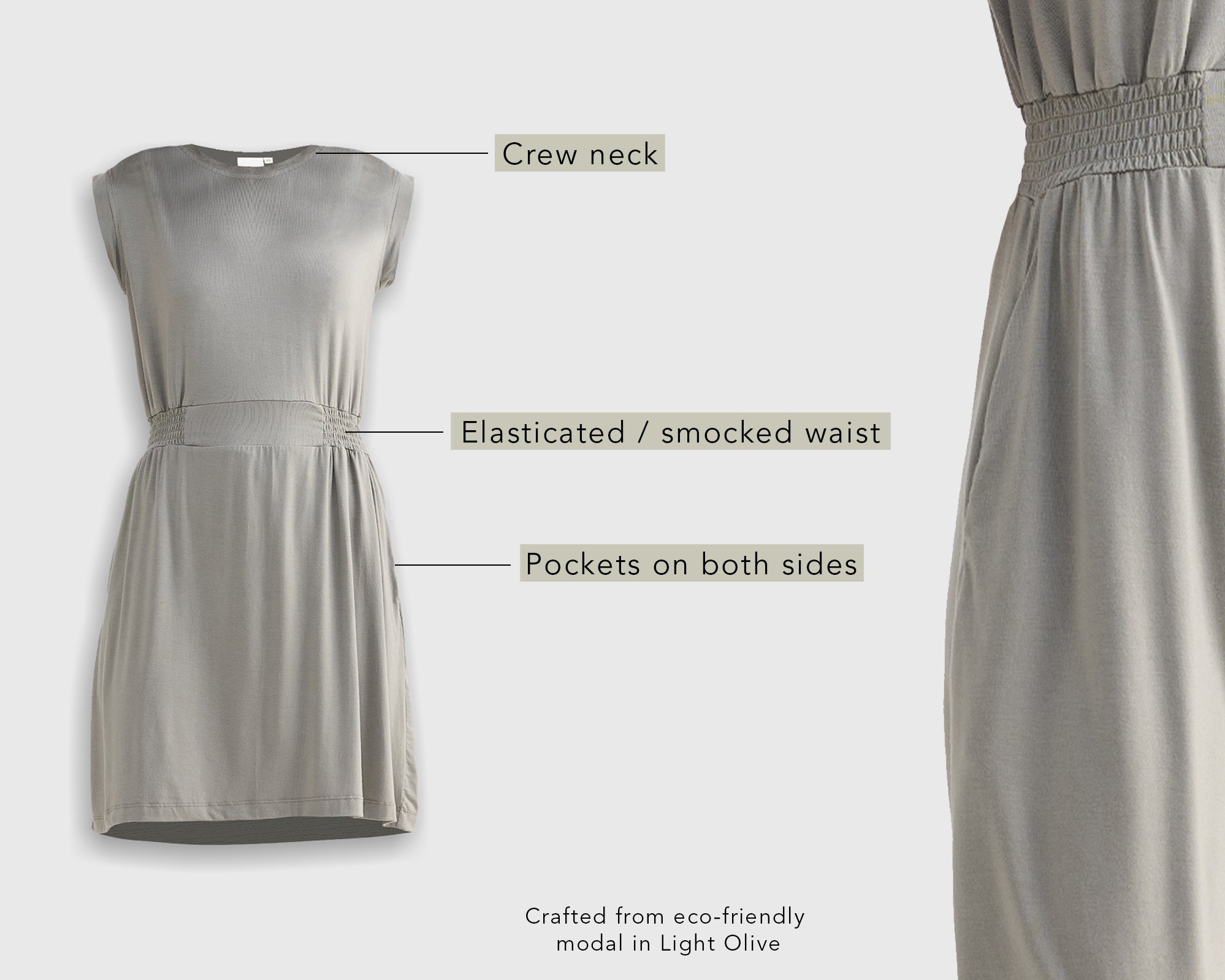 Made from an eco-friendly modal knit, this light olive dress has a lightly elasticated cinched waist for a customized and flattering fit while the side pockets offer comfort and style.
