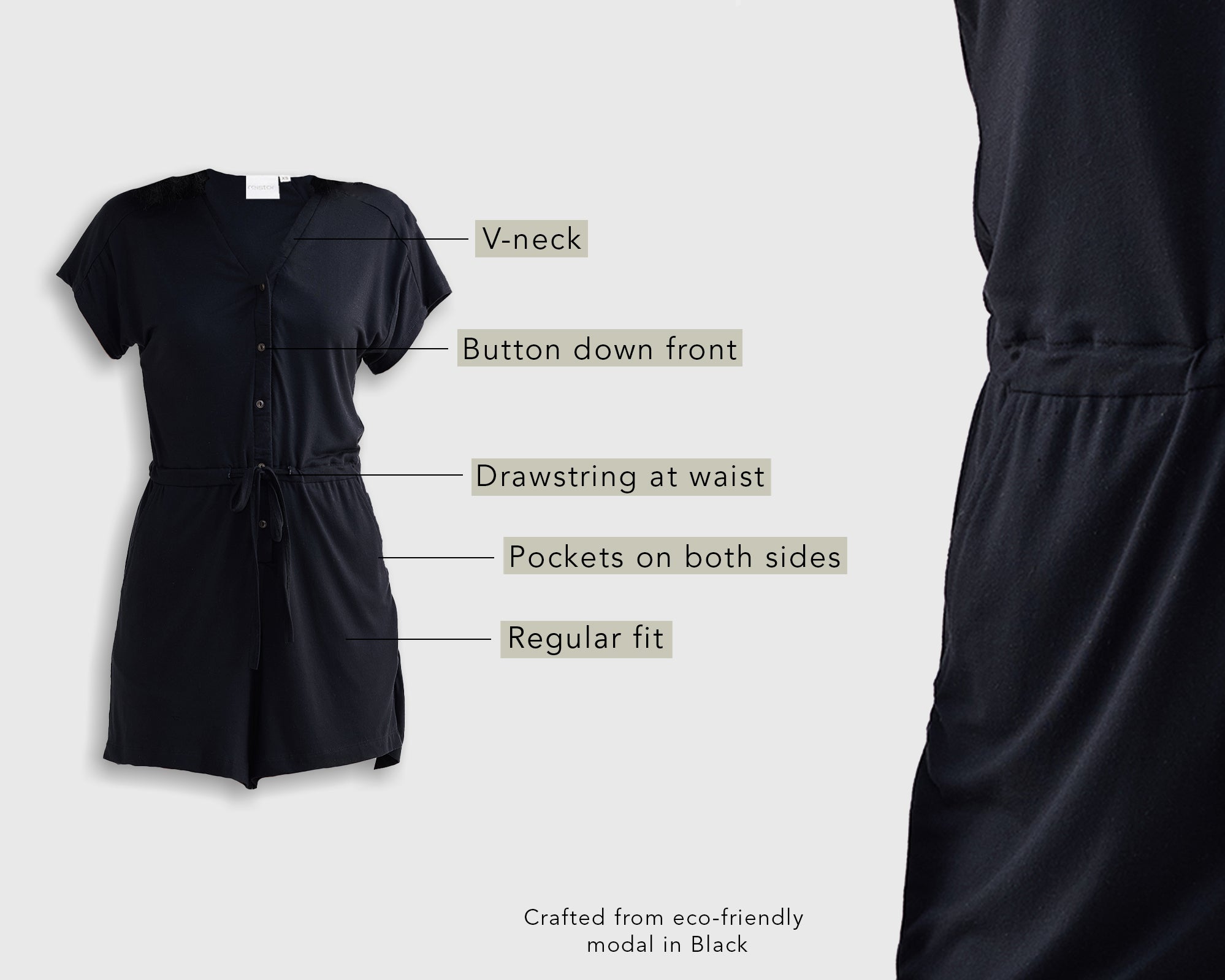 This is a classic black romper of your dreams, made with a silky soft eco-friendly modal fabric that feels like butter against your skin. We love the regular fit, short sleeves, and drawstring waist that makes this the perfect look.