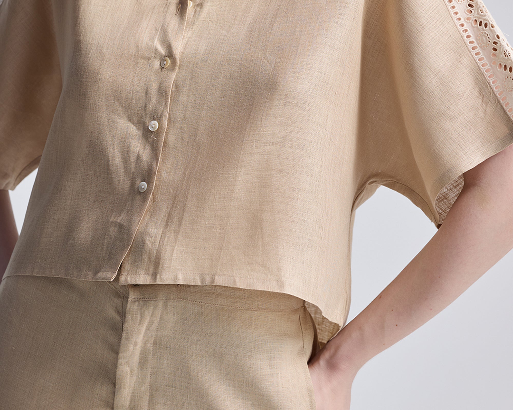Effortlessly chic, this Boxy Shirt with Lace Set is made from 100% hemp in neutral beige. The relaxed-fit shirt features delicate lace detailing, that adds an extra touch of elegance, and the adjustable drawstring shorts ensure all-day comfort. Light, breathable, and versatile, this set is your go-to for warm days and easy styling.