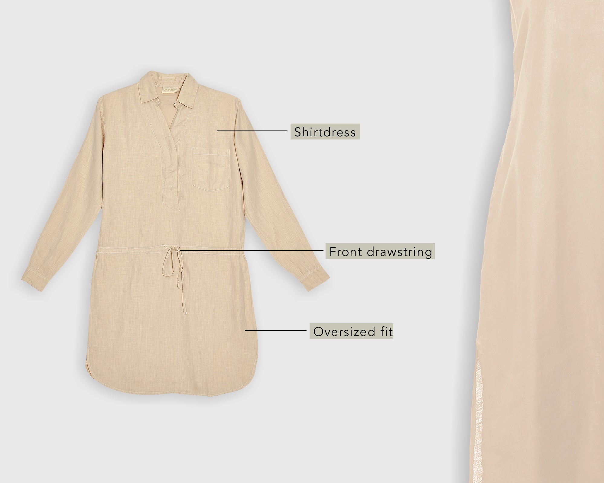 Subtle sophistication and contemporary style come together in this oversized, collared shirt dress in Neutral beige with a front pocket and adjustable drawstring.