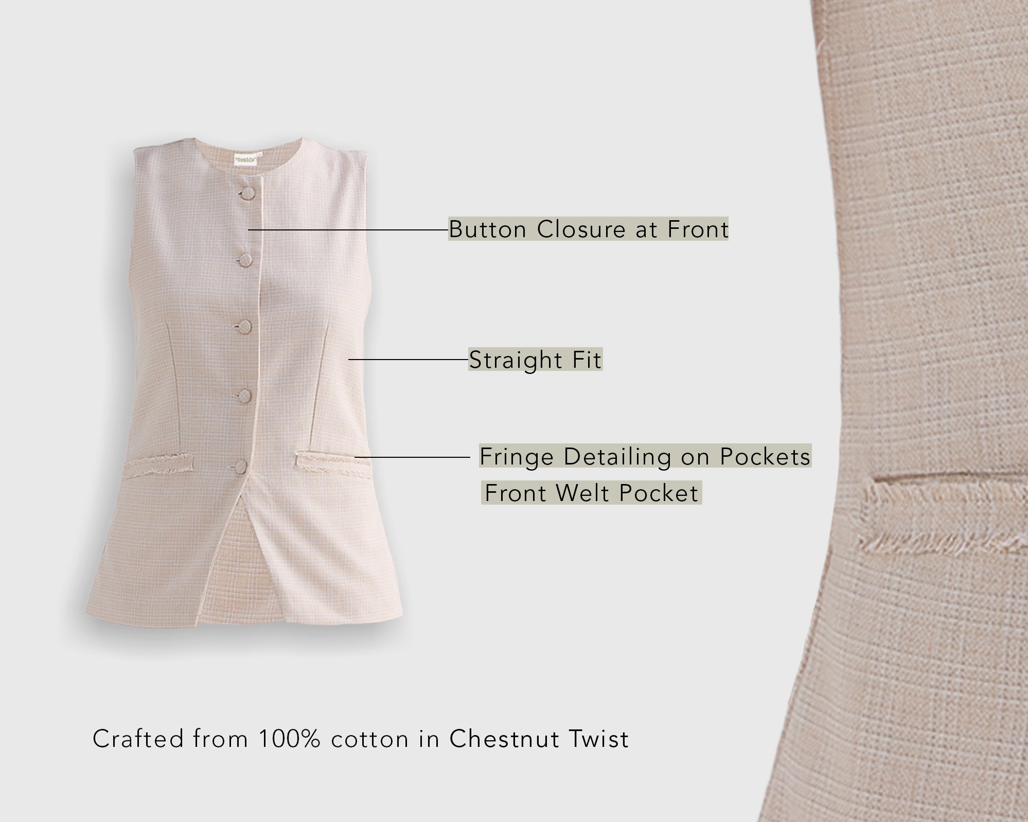 Whether you’re heading to a business meeting or a casual outing, this sleeveless jacket in cream color is your go-to choice for effortless style. The sleeveless finish, round neck, and front pockets combined with a complete button closure give it quite a classic appeal. Pair it with our matching Cotton Tweed Shorts for the ultimate stylish look.