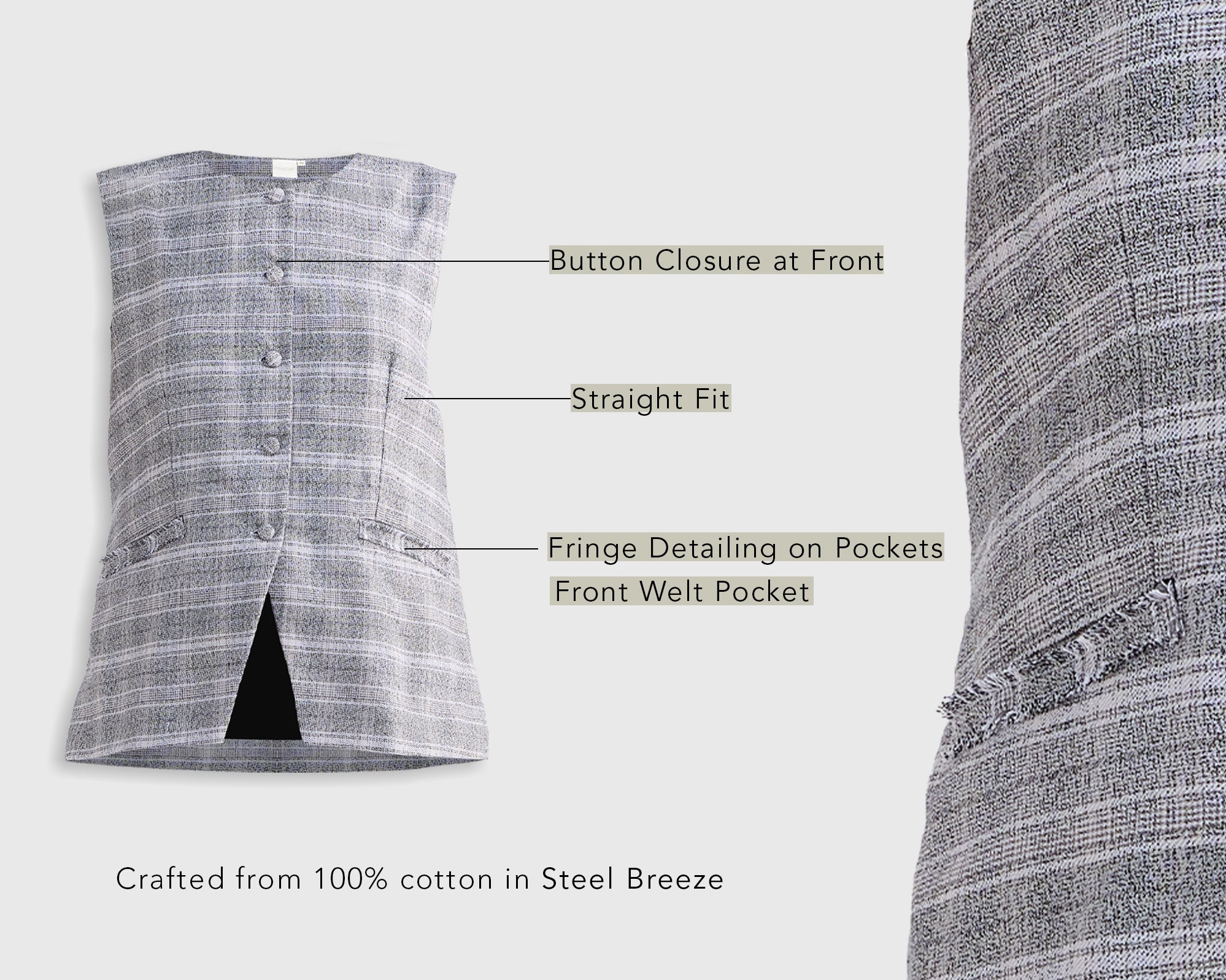 Whether you’re heading to a business meeting or a casual outing, this sleeveless jacket is your go-to choice for effortless style. The sleeveless finish and front pockets combined with a complete button closure give it quite a classic appeal. Pair it with our matching Cotton Tweed Shorts for the ultimate stylish look.