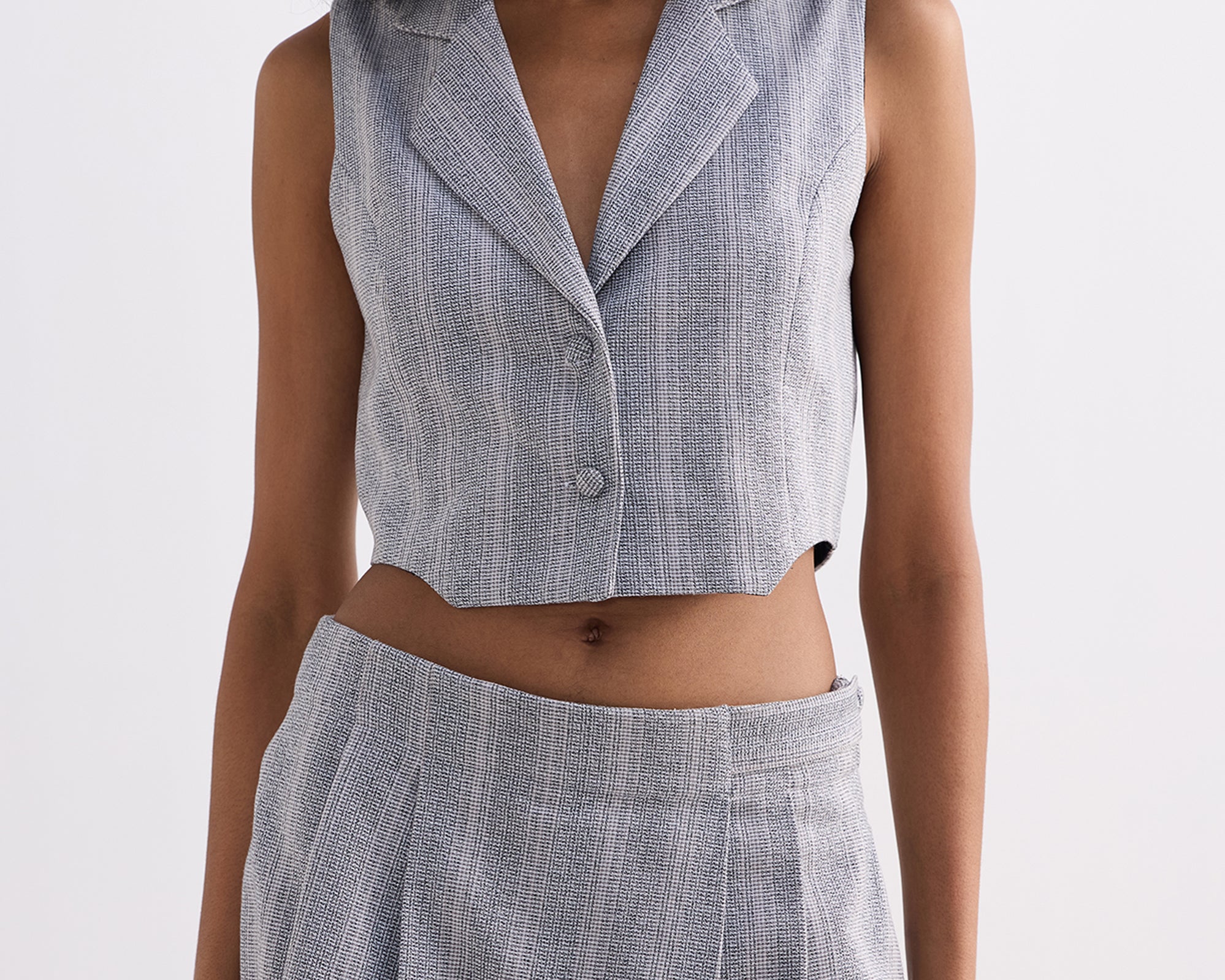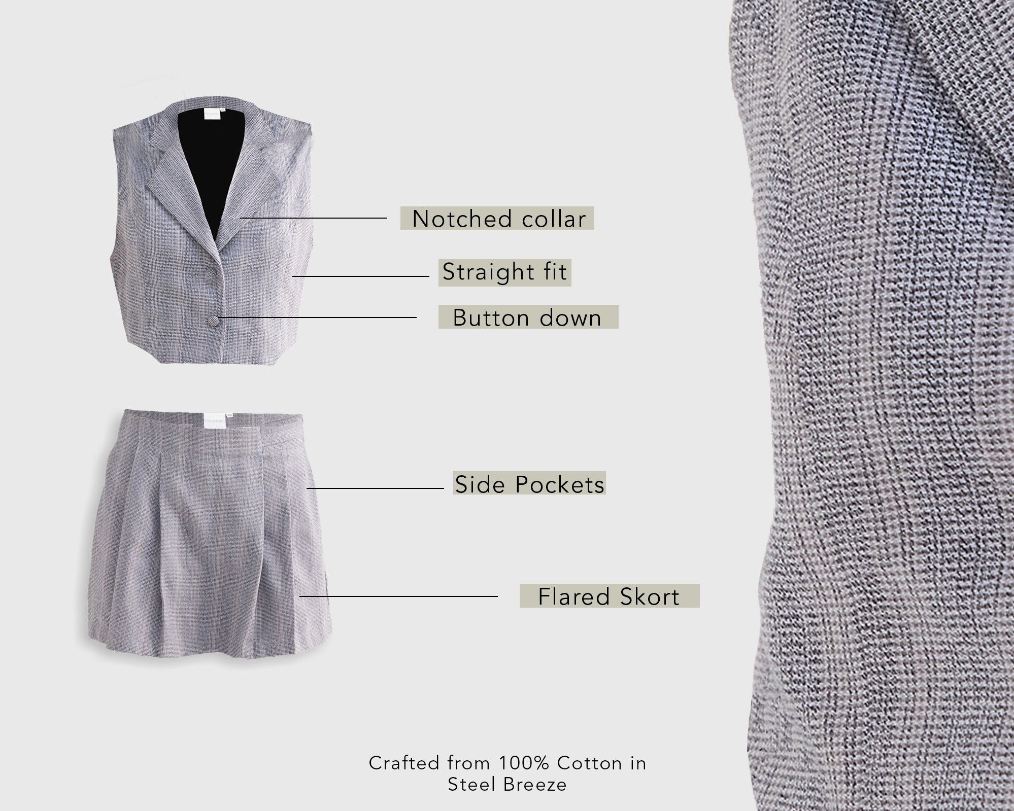 Designed for a tailored yet comfortable fit, this cropped cotton tweed vest set in grey adds effortless sophistication to your wardrobe. The vest features a button-down front with a notched collar and a matching skort. The pleated front and side pockets add charm and practicality, making it ideal for any occasion. This set offers versatile styling options, from a sophisticated look to a more casual vibe.