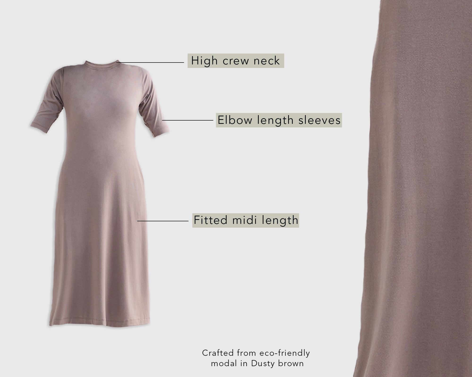 High Crew Neck Elbow Sleeves Fitted Dress in Dusty Brown