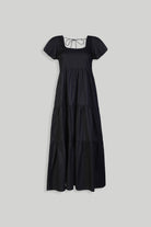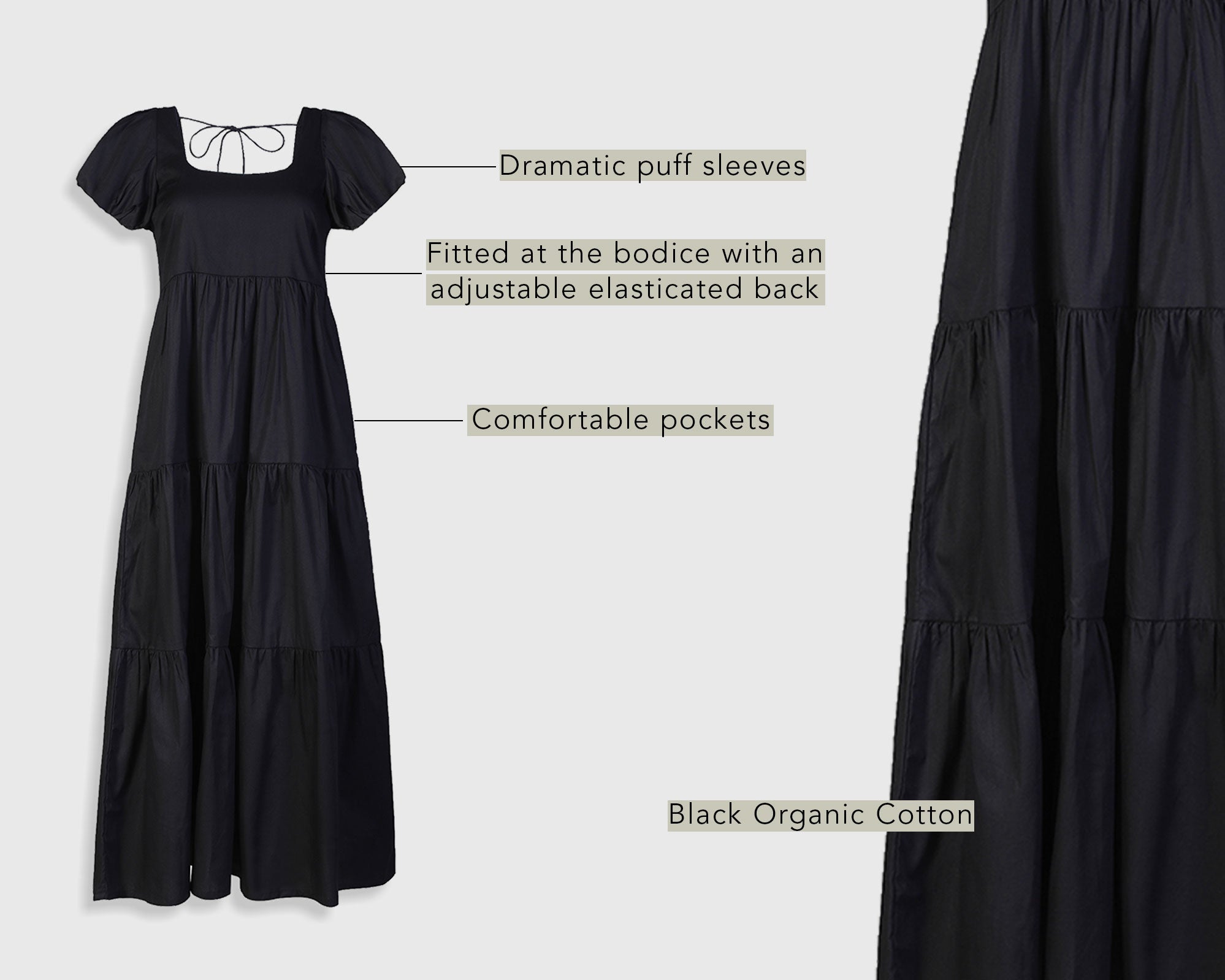 A dreamy black maxi dress layered with delicate tiers. The flowing silhouette and tiered design offer a flattering fit and comfortable wear. Its chic puff sleeves and back tie add a touch of drama to this effortlessly comfy outfit.