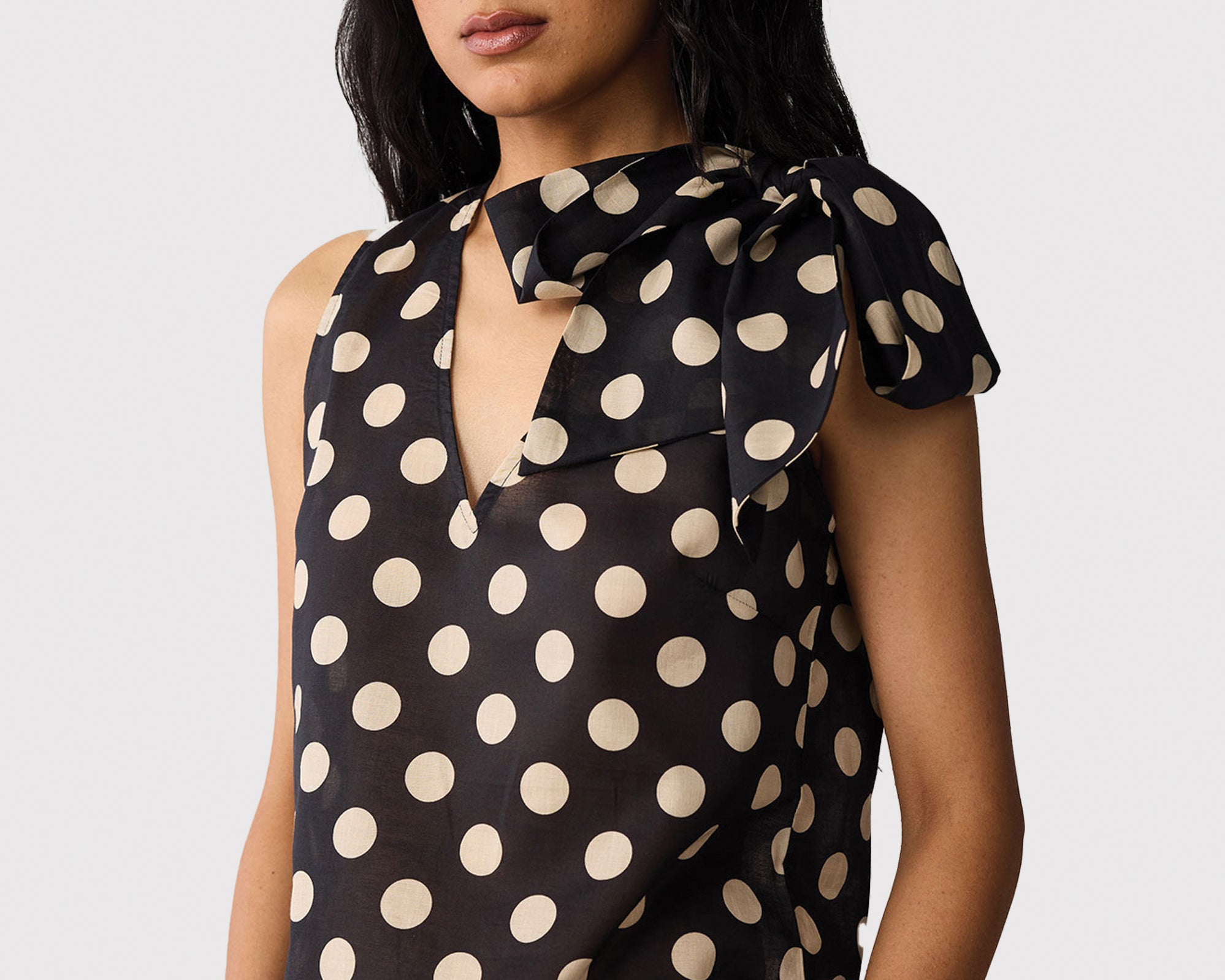 Here’s a stylish, comfy, easy polka dot top with a timeless feel. Made from 100% cotton, it’s soft, breathable, and perfect for all-day wear. The classic print, V-neck, and playful tie-up straps (which you can tie as you like) add just the right charm, making this piece easy to style for everyday plans, weekends, travel, or casual get-togethers.