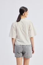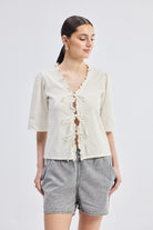 Relaxed Fit Top With Ruffles and Front-Ties in Cream