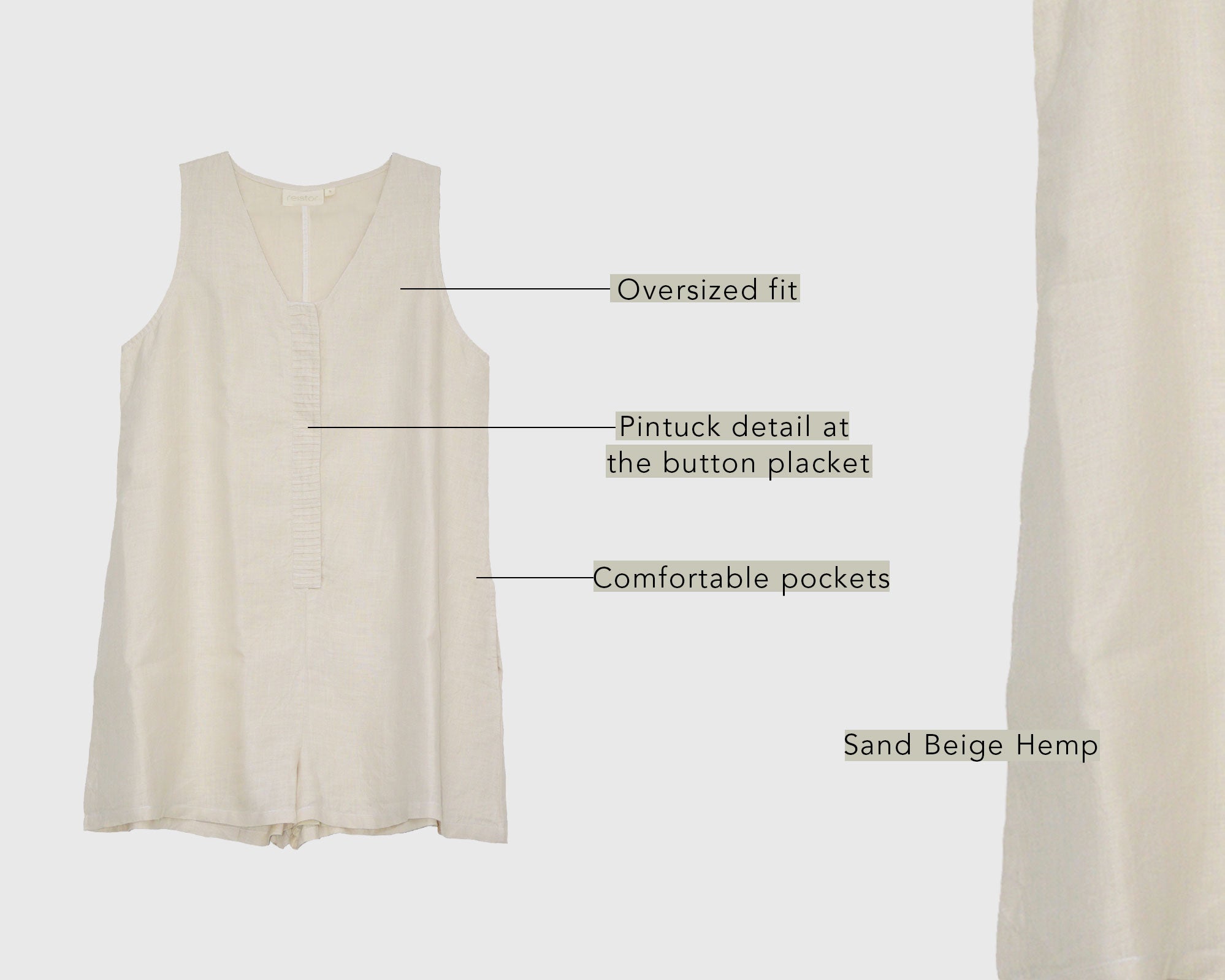 This cute Romp And Play Romper is an absolute summer-essential owing to its relaxed, airy fit and breathable hemp fabric. The classic beige color gives it a solid neutral base for countless ways of styling. Signature pin tucks along the placket add sophistication, while functional pockets on both sides provide practicality without compromising style.