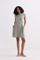 Made from an eco-friendly modal knit, this light olive dress has a lightly elasticated cinched waist for a customized and flattering fit while the side pockets offer comfort and style.