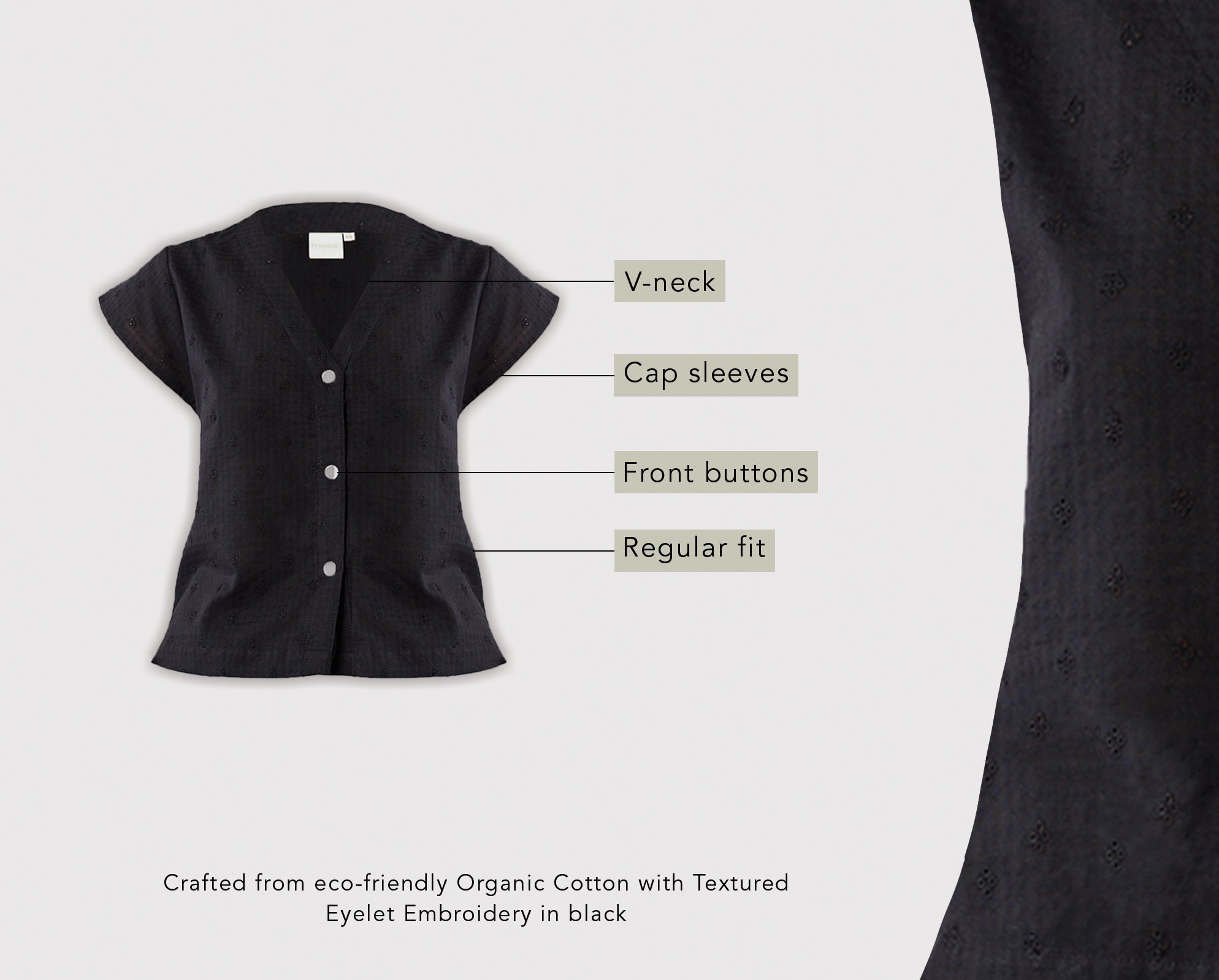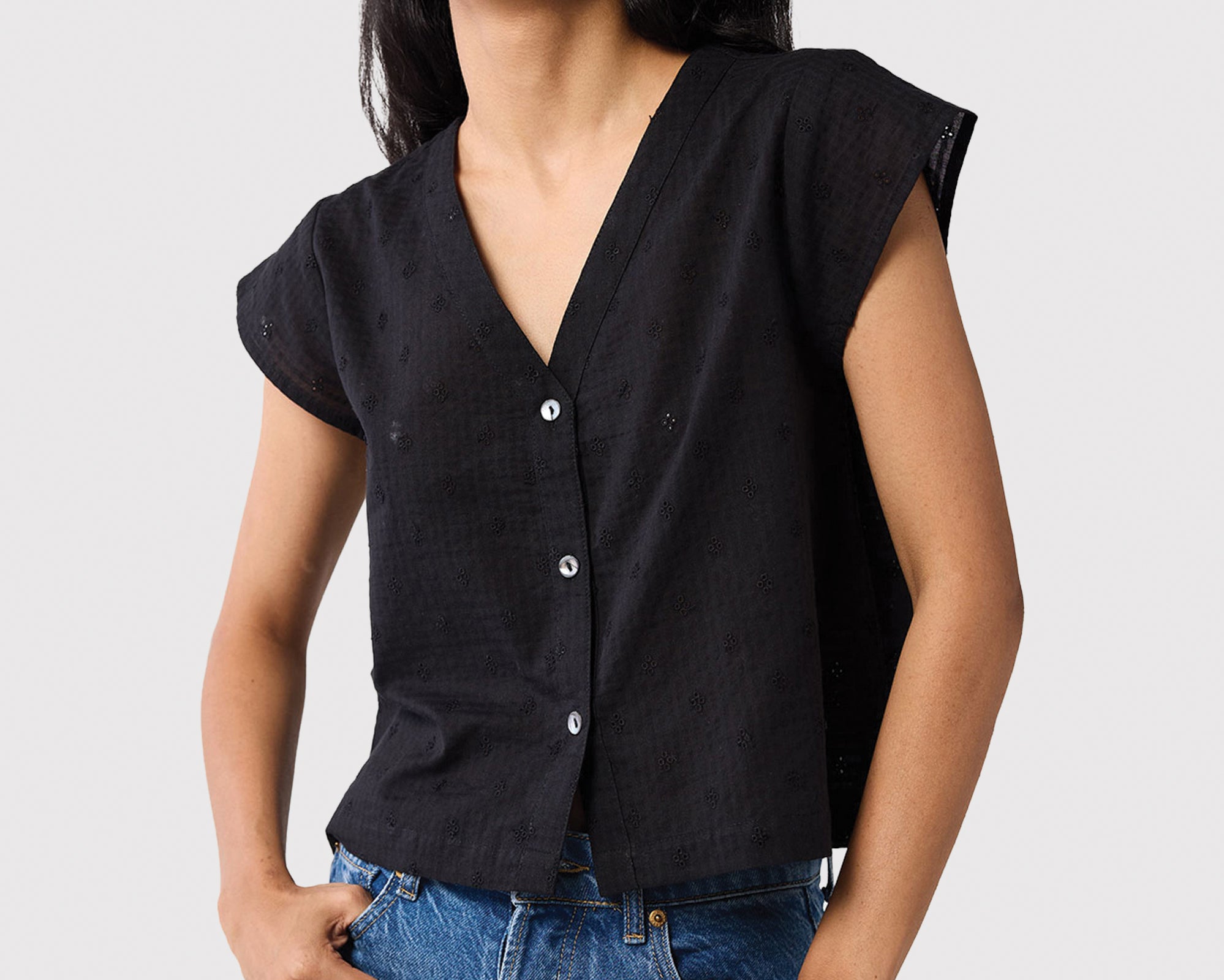 Here’s a chic black everyday essential, consciously made using 100% organic cotton. Soft, breathable, and lightweight, it’s designed for easy, all-day wear. Featuring delicate embroidery, a V-neck, front buttons, and relaxed cap sleeves, this versatile top will easily become one of your go-tos, an everyday favorite.
