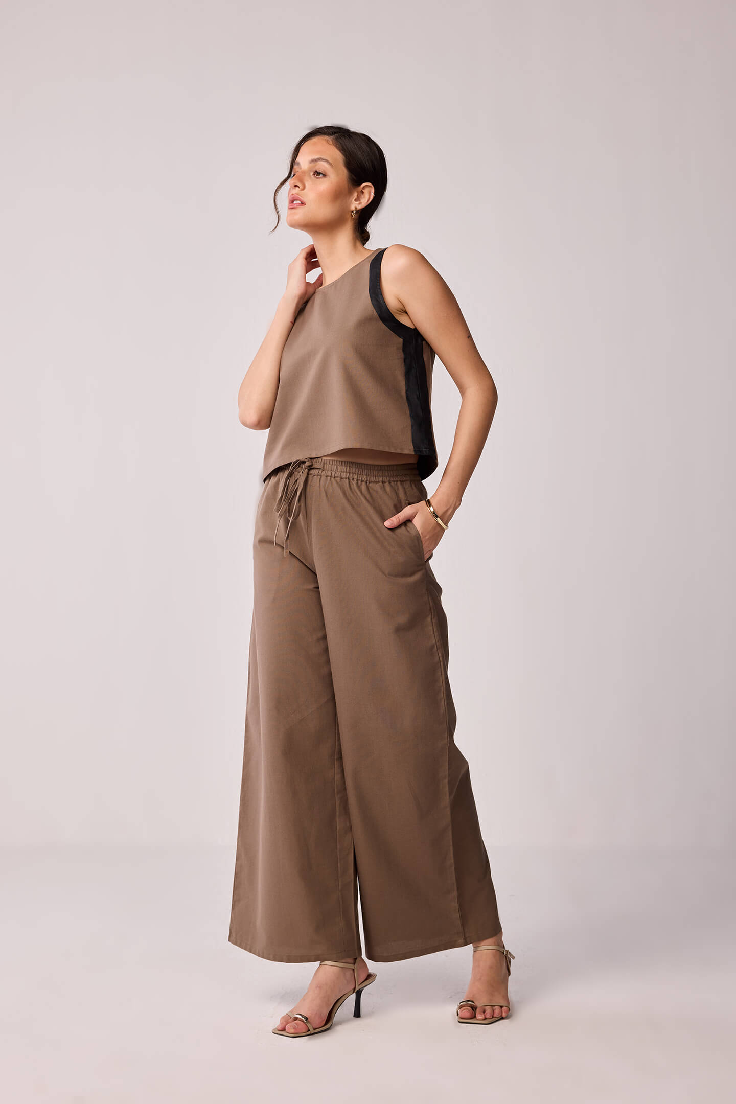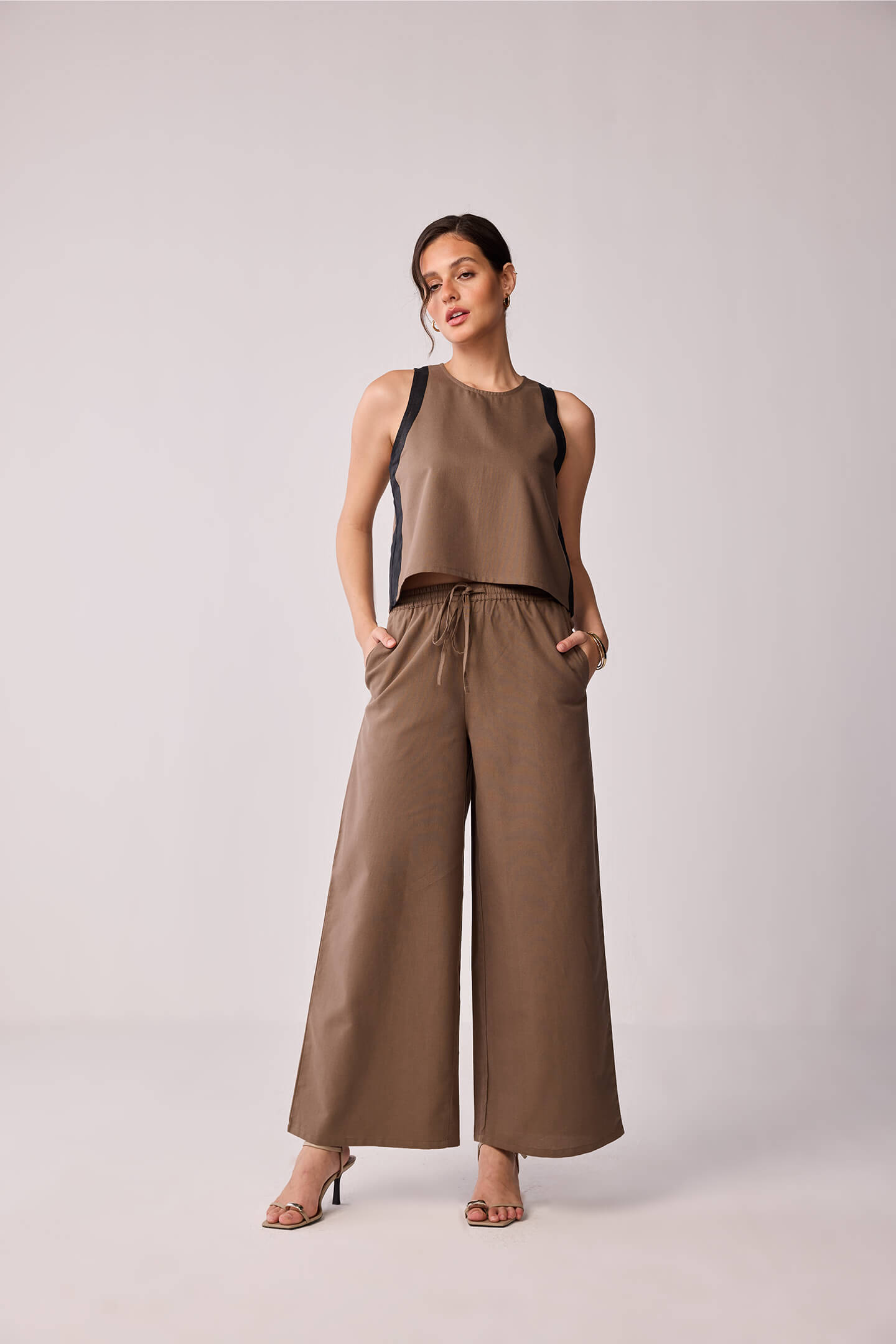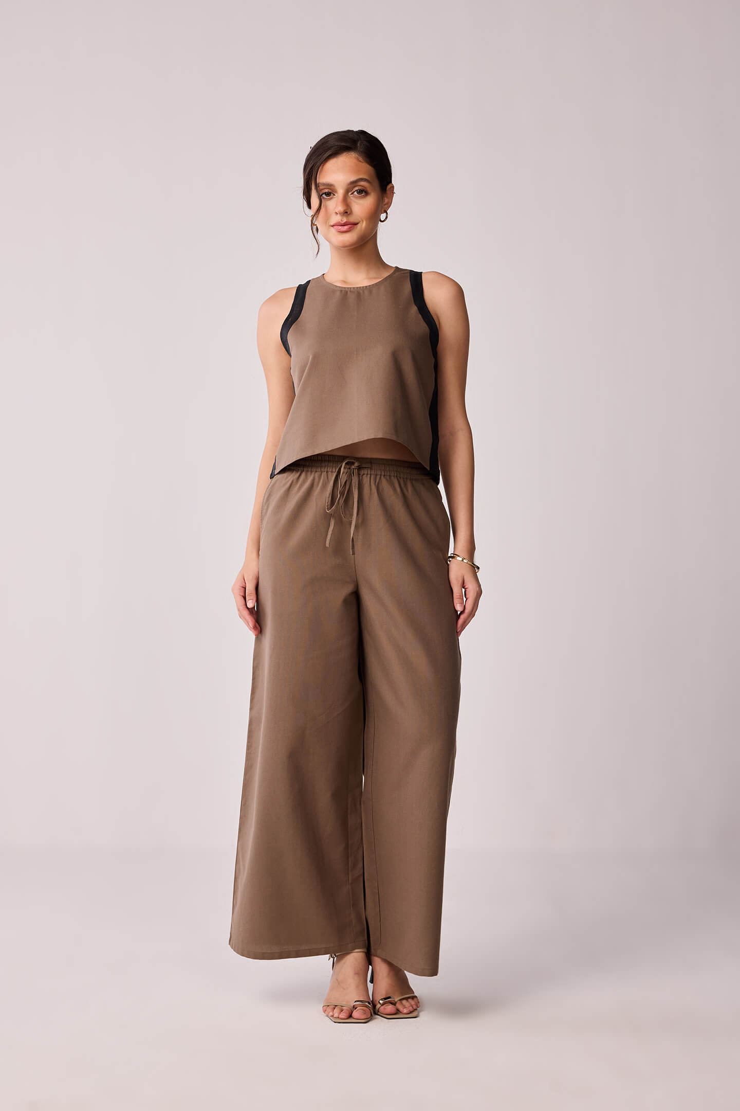 A classic sleeveless top in brown and black, crafted in 100% cotton for all-day comfort. With its round neck and color block pattern, it’s the kind of piece you can throw on for work, brunch, or running errands in style